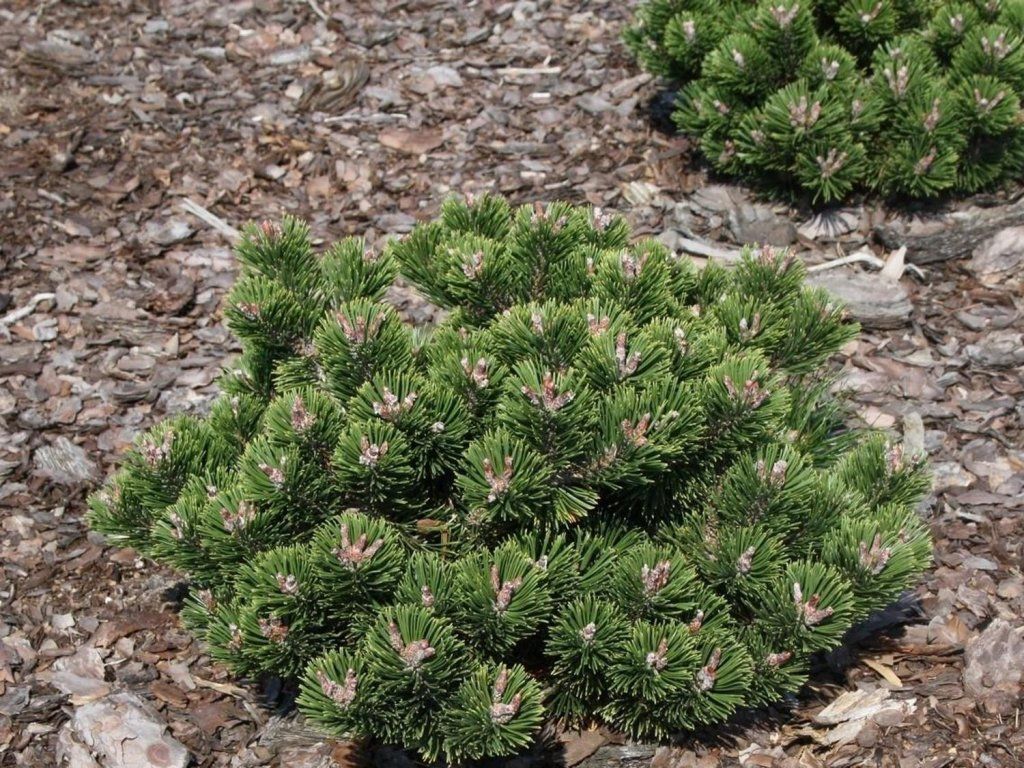 Zwergkiefer 'Sherwood Compact' - eine einzigartige Kiefernsorte, die aus den Bergregionen Mitteleuropas stammt, wo sie auf felsigen Hängen wächst, die Wind, Schnee und Frost ausgesetzt sind. Die Sorte 'Sherwood Compact' wurde in den 1950er Jahren vom Züchter Andy Sherwood in Oregon, USA, entdeckt und anschließend in die Baumschulproduktion übernommen. Gehört zu den Zwergformen mit sehr langsamem Wachstum und einem flachkugeligen, leicht kissenartigen Habitus. Unter unseren Bedingungen erreicht er eine Höhe von ca. 1 m und eine Breite von 1–1,2 m, die jährlichen Zuwächse bewegen sich meist um 5–10 cm. Kurze, aufrechte Zweige tragen steife, dunkelgrüne Nadeln, die zu zweit in Büscheln wachsen und im Winter oft eine feine goldene Tönung an den Spitzen aufweisen. Das dichte Nadelkleid erzeugt den Eindruck eines kontinuierlichen grünen Kissens, kleine braune Zapfen bleiben eher ein unauffälliges Detail. Die Sorte 'Sherwood Compact' kommt in kleineren und größeren Gärten als niedriger Strauch für Steingärten, Schotter- und Heidegärten, an trockene Hänge sowie für Vorgärten zum Einsatz. Auch für die Kultur in mittelgroßen Kübeln auf Terrassen ist sie geeignet, wo sie einen ganzjährigen grünen Akzent bietet und sich leicht mit Stauden und Ziergräsern kombinieren lässt.