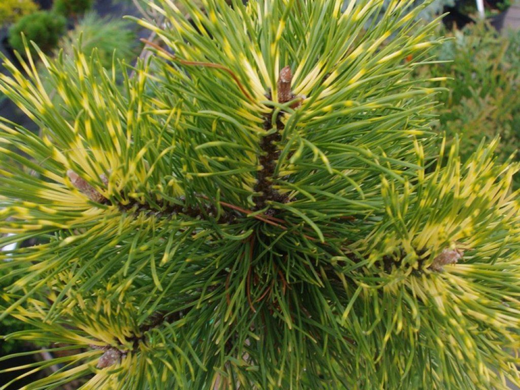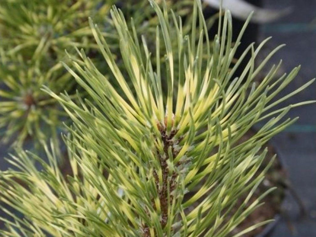 Zwergkiefer 'Sunshine' - eine Gebirgsart Mittel- und Südeuropas, angepasst an Wind, Schnee und karge, steinige Böden. Die Sorte ‘Sunshine’ wurde laut Züchterangaben 1992 in den Niederlanden entdeckt und wird für ihre hell gefärbten Frühlingszuwächse geschätzt. Der Habitus ist unregelmäßig buschig, breit ausgebreitet, ohne ausgeprägten Hauptstamm. Im Garten erreicht sie normalerweise eine Höhe von ca. 0,7–1 m und eine Breite von 1–1,8 m, der jährliche Zuwachs beträgt wenige Zentimeter. Die Nadeln stehen zu zweit in Büscheln, können leicht gedreht sein und bis zu 6–8 cm lang werden. Älteres Laub ist grün, neue Triebe im Frühjahr gehen ins Cremegelb bis Weißliche über, oft mit feiner Streifung. Der Kontrast zwischen jungen und reifen Nadeln erzeugt besonders von April bis Juni eine ausgeprägte Struktur. In Kompositionen wird sie als farblicher Akzent in Kiesbeeten, auf Felsen, Heidegärten und in Gefäßen eingesetzt, wo sie dunkelgrüne Wacholder und Zwergkoniferen gut ergänzt. Es ist jedoch wichtig zu beachten, dass die gelbe Farbe der jungen Triebe empfindlich auf Sonnenbrand im Frühjahr reagiert. Daher wird empfohlen, die Pflanze an geschützten und leicht beschatteten Standorten zu platzieren.