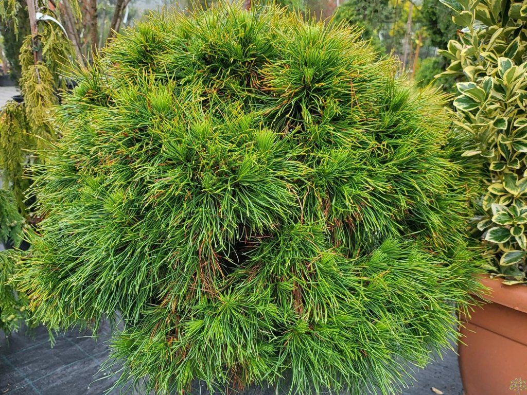 Latschenkiefer 'Varella' - eine attraktive Sorte aus den Bergregionen Süd- und Mitteleuropas, wo sie oberhalb der Baumgrenze an felsigen Hängen wächst, die oft Wind, Schnee und starkem Frost ausgesetzt sind. Aus dieser Umgebung bringt sie eine hohe Widerstandsfähigkeit und die Fähigkeit mit, in ärmeren, durchlässigen Böden gut zu gedeihen. Die Sorte ‘Varella’ ist eine Zwerggartenform mit sehr langsamem Wachstum und einem dichten, kugelförmigen bis leicht kissenförmigen Wuchs. Ältere Pflanzen erreichen unter unseren Bedingungen normalerweise eine Höhe von 1–1,2 m und eine ähnliche Breite, wobei die jährlichen Zuwächse etwa 5–10 cm betragen. Das typische Merkmal der Nadeln ist die Kombination von zwei Längen. Während der Saison entstehen an den Zweigenden kurze Nadelbüschel, die kleinen Bürsten ähneln, und im folgenden Jahr verlängern sich diese Nadeln auf 10–11 cm. Ältere Nadeln sind leicht gewellt bis verdreht, tief dunkelgrün, im Winter ändert sich die Farbe zu einem helleren Grün bis gelbgrünen Ton. Die Nadeln wachsen, wie bei anderen Kiefern auch, zu zweit in Büscheln und bilden das ganze Jahr über einen dichten, plastisch wirkenden Bewuchs. Kleine Zapfen bilden sich eher unauffällig, die Hauptzierde bleibt die Form und Textur der Nadeln.
