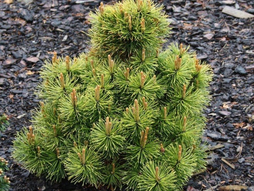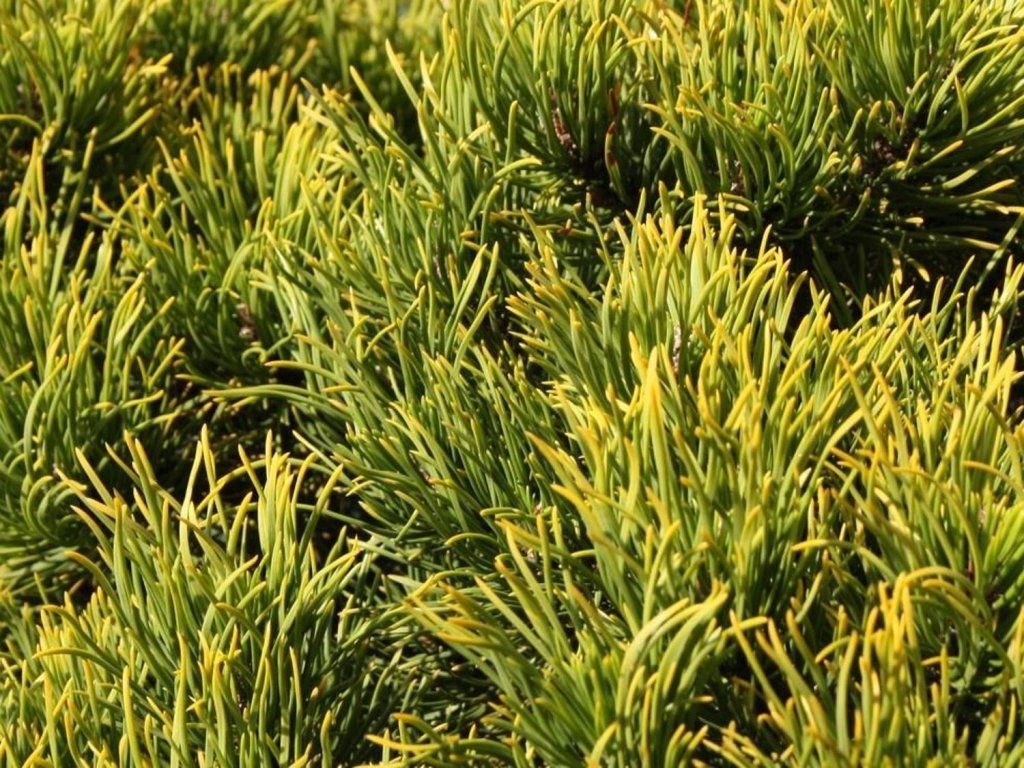 Zwergkiefer 'Wintersonne' - eine Zwergkiefer-Sorte, die für ihre deutliche Farbveränderung der Nadeln in der kalten Jahreszeit bekannt ist. Grüne Nadeln verfärben sich ab Herbst allmählich goldgelb und bilden im Winter einen hellen Akzent, der auch aus größerer Entfernung gut sichtbar ist; im Frühling kehrt er zu einem grün-goldenen Farbton zurück. Das Wachstum ist in der Regel kegelförmig bis halbkugelförmig, mit dichten Ästen und kurzen Trieben, die auch ohne häufiges Beschneiden eine kompakte Silhouette beibehalten. Sie hat keine Dornen, daher ist sie auch für Gärten mit Kindern und für Gehwege geeignet, wo ihr immergrüner Effekt geschätzt wird. Im Alter von zehn Jahren erreicht sie eine Breite von etwa 0,7 m und eine Höhe von 1,5 m, im vollen Erwachsenenalter liegt sie ungefähr im Bereich von 1,5–2 m × 0,8–1,2 m. Die Zapfen bilden sich unauffällig und sind nicht der Haupteffekt, dekorativ ist vor allem die Farbe und Textur der Nadeln im Kontrast zu Schnee und dunklen Wänden. Die Sorte wird als Solitär an Eingängen, in Vorgärten und in Kiesbeeten eingesetzt, wo die regelmäßige Form zur Geltung kommt, im Steingarten ergänzt sie Steine und niedrige Stauden. In Kompositionen lässt sie sich gut mit dunkelblättrigen Gehölzen, wie Berberitzen und Spieren, sowie mit Trockenstauden kombinieren, in naturnäher gestalteten Pflanzungen mit Heidekraut, Preiselbeeren und Heidelbeeren. Anfangs wächst sie relativ schnell, mit dem Alter verlangsamt sich das Wachstum.