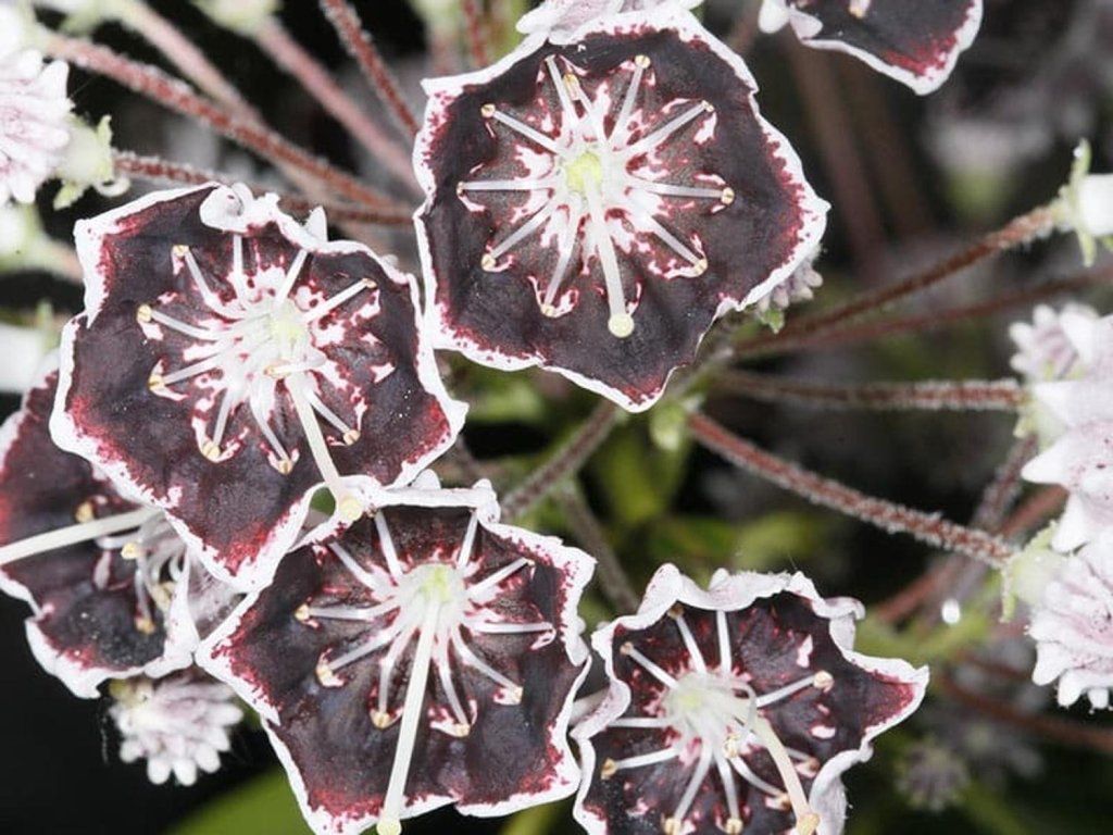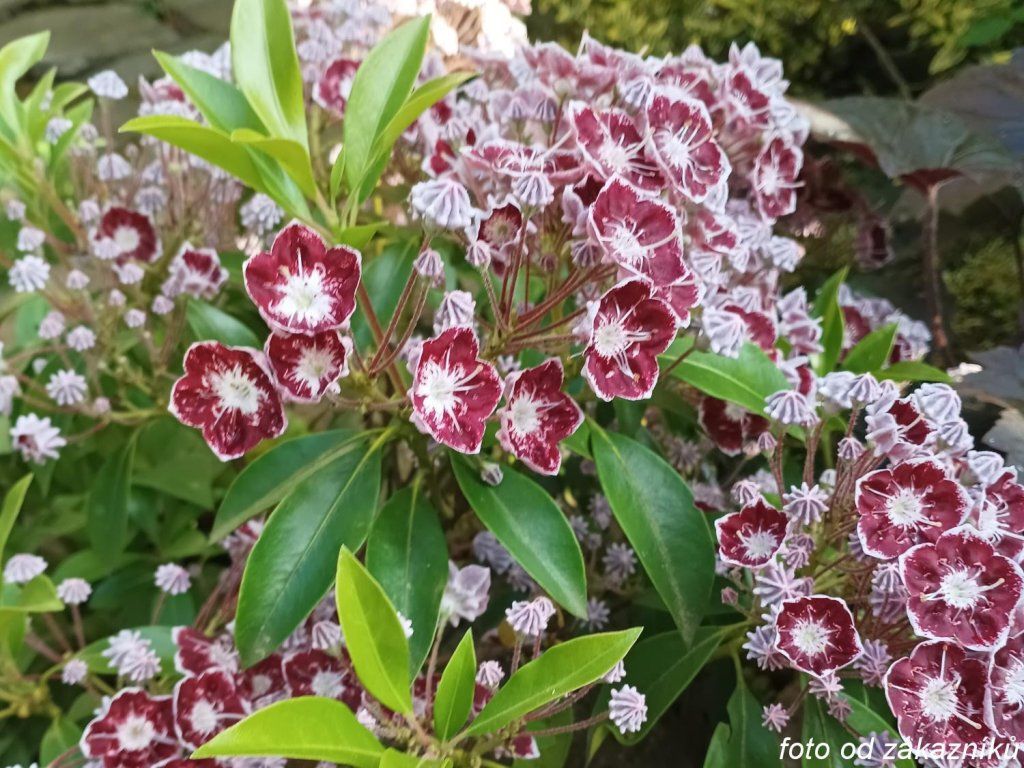 Berglorbeer 'Mitternacht' - immergrüner Kultivar des Breitblättrigen Berglorbeers, eines nordamerikanischen Moorstrauchs aus der Familie der Heidekrautgewächse. Die Sorte wurde um 2007 eingeführt und gewann schnell an Aufmerksamkeit durch ihre ungewöhnlich dunkle Blüte. Sie bildet einen dichten, aufrechten bis breit kompakten Strauch, der in der Reife etwa 1–1,5 m hoch und ähnlich breit wird, unter günstigen Bedingungen kann er etwas größer sein. Die Blätter sind ledrig, schmal elliptisch bis lanzettlich, dunkelgrün, mittel bis stark glänzend und bleiben das ganze Jahr über an der Pflanze. Die Hauptzierde sind die Blüten in reichen endständigen Dolden. Die Knospen sind hellrosa und nach dem Öffnen entstehen regelmäßige, becherförmige Blüten in dunkelweinroter bis fast schwarzweinroter Farbe mit einem feinen weißen Rand. Gerade dieser Kontrast verleiht dem Kultivar einen Ausdruck, der zwischen den Kalmien außergewöhnlich tief und feierlich wirkt. Er blüht meist von Ende Mai bis Juni. Der Kultivar eignet sich für Heidegärten, kleinere Gärten, Sammlungsanpflanzungen und als auffälliger Solitär in der Nähe von Wegen oder Terrassen. Er lässt sich gut mit Rhododendren, Azaleen, Pieris, Skimmien, Leucothoe, Farnen oder Funkien kombinieren. Die Pflanze ist bienenfreundlich und gleichzeitig beim Verzehr giftig.