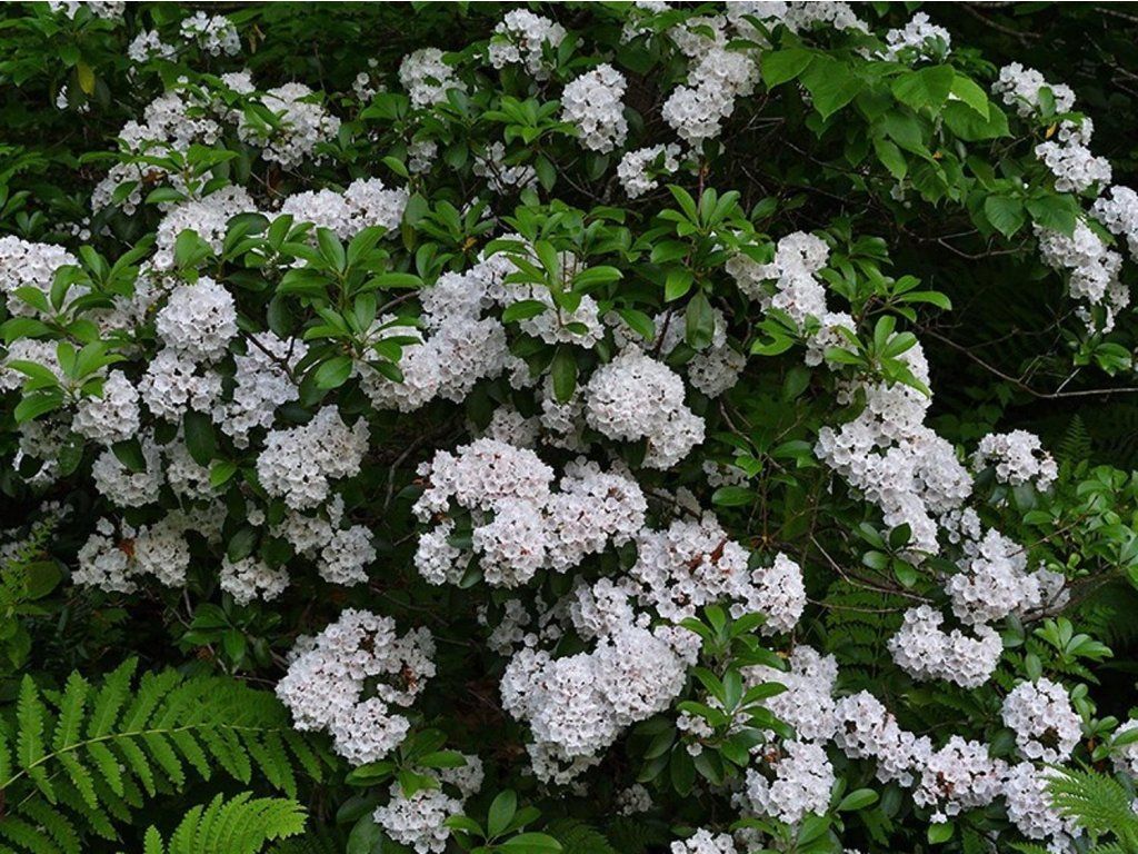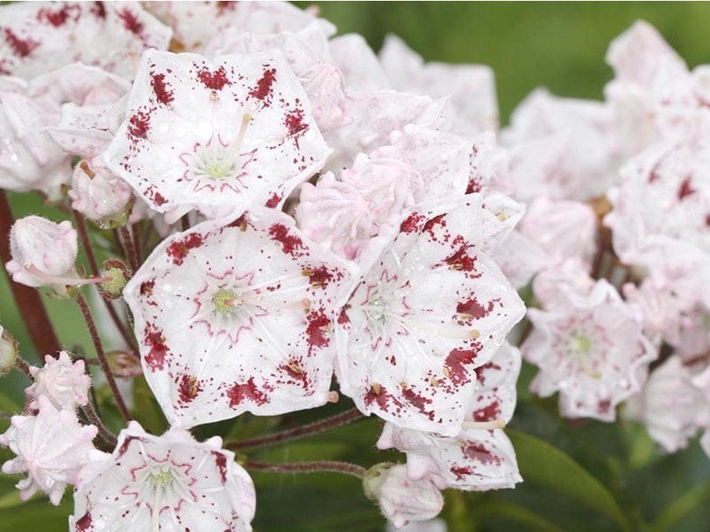 Berglorbeer, Kalmia 'Radiata' - kompakter, immergrüner Strauch mit dichtem Wuchs. Im Laufe von zehn Jahren erreicht er eine Höhe von 0,9 m und eine Breite von 0,8 m. Die Blätter sind lanzettlich, dunkelgrün und glänzend. Knospen sind hellrosa bis weiß, entwickeln sich zu weißen Blüten mit einem ausgeprägten dunkelweinroten Ring und Punkten auf der Innenseite. Die Blüten sind in reichen endständigen oder seitlichen Blütenständen angeordnet - bei diesem Kultivar können wir bis zu 170 einzelne Blüten an einem Blütenstand zählen. Blüht im Juni.