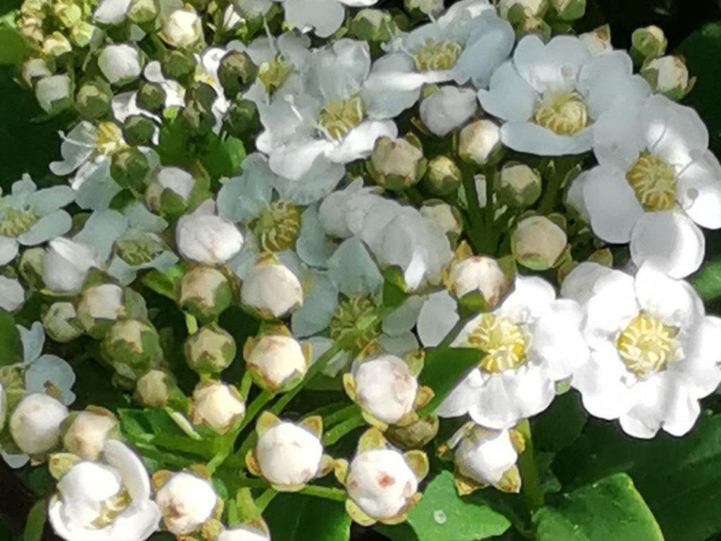 Spierstrauch 'Island' - bildet einen niedrigen Strauch, der bis zu 1 m hoch wird. Sägeförmige Blätter sind grün gefärbt, mit einem gräulichen Schimmer auf der Unterseite. Er blüht im Juni, die kleinen Blüten sind weiß und bilden kompakte, flache Blütenstände. Der Strauch ist pflegeleicht und eignet sich auch für die Pflanzung in Hecken.
