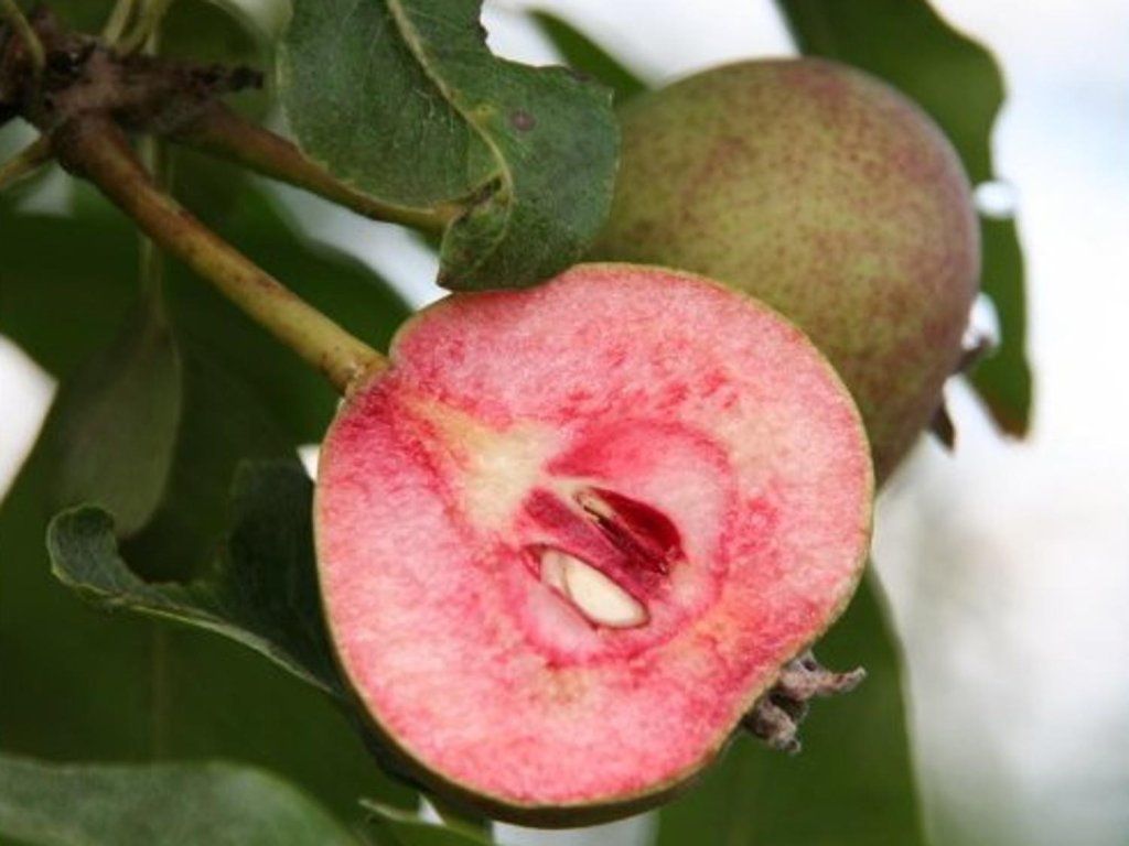Birne 'Sanguinole' - syn. Blutbirne, Rote Birne. Alte, seltene Sorte aus Frankreich, ungewöhnlich durch ihr rot gefärbtes Fruchtfleisch. Die Früchte sind kleiner und ähneln in ihrer Form eher Quitten. Die Grundfarbe der Schale ist bronzefarben, später rotbraun. Das Fruchtfleisch ist rot marmoriert, mittelknackig, saftig und vor allem sehr süß. Der Geschmack wird von einem typischen Birnenaroma begleitet. Die Früchte reifen Anfang September, gelagert halten sie sich ca. 4 Wochen. Sie ist perfekt für den direkten Verzehr, eignet sich aber auch zur Verarbeitung. Ein geeigneter Bestäuber ist die Williamsbirne.