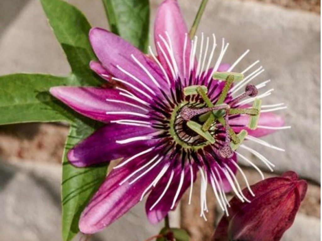 Blaue Passionsblume 'Victoria' - eine der winterhärtesten Sorten. Die Blaue Passionsblume ist eine immergrüne Kletterpflanze mit interessanten Blüten, die bis zu 10 cm groß sind. Victoria hat rot gefärbte Blüten. Sie sind wirklich wunderschön, wirken interessant und geheimnisvoll. Die Blüten erscheinen von Februar bis September. Die Pflanze wächst bis zu 2-2,5 m und benötigt eine Stütze. Die Lianen zieren tief eingeschnittene und gelappte Blätter. Die Frucht ist eine orange Beere mit süßem rotem Fruchtfleisch, diese Früchte sind bekannt unter dem Namen Maracuja.