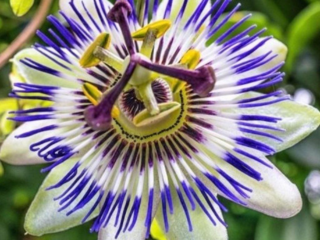 Blaue Passionsblume <\/strong>- eine der schönsten Kletterpflanzen. Sie bildet energisch wachsende Lianen, die eine Höhe von 6-9 m und eine Breite von 0,9-1,8 m erreichen können. Die Blätter sind zusammengesetzt, handförmig gelappt, mit 5-7 Lappen. Sie werden von wunderschönen, exotischen Blüten fasziniert sein. Diese sind sternförmig, in Weiß, manchmal bis Hellrosa, mit einem dekorativen Kranz aus weiß-blauen bis violetten Fasern. Sie erreichen einen Durchmesser von 8 cm. Ende des Sommers können wir dunkelorangefarbene Früchte ernten.