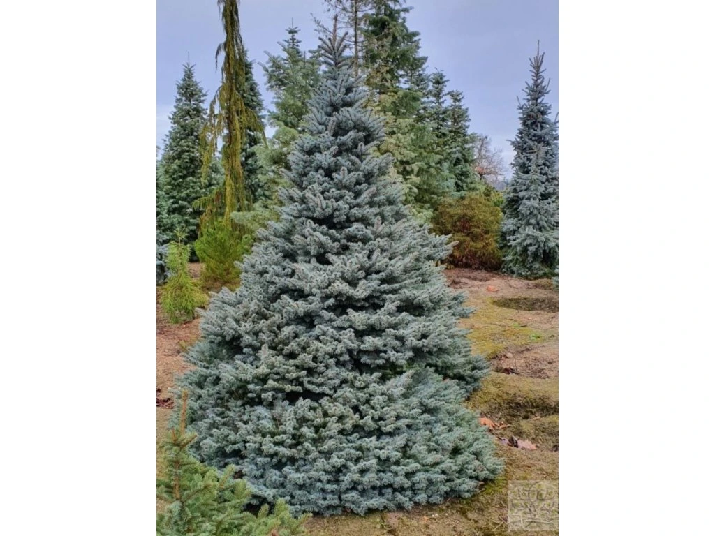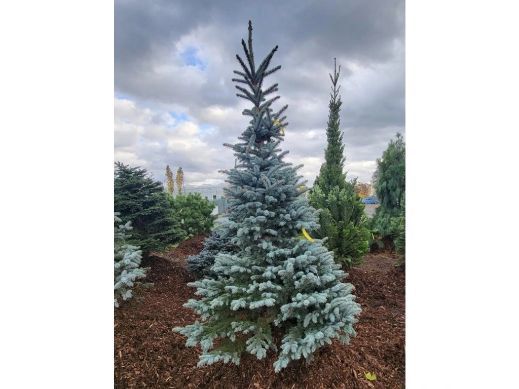 Blaufichte, auch Silberfichte genannt. Ein schöner Nadelbaum, der aus Nordamerika stammt, wo er an den Ufern von Gebirgsflüssen und auch an sumpfigen Orten wächst. Er gedeiht sowohl in Schwarzerde in der Steppenzone als auch auf Torf- und vernässten Böden. Die Nadeln sind länger, steif und stachelig. Sie haben eine mattgrüne, graugrüne bis silbrig-weiße Farbe und weisen auf jeder Seite 3–6 Reihen von Spaltöffnungen auf. Die Zapfen sind weich, zylindrisch-länglich, in der Jugend meist grün, in der Reife hellbraun. Er erreicht eine Höhe von 30 m, selten bis 50 m. Die Krone ist dicht verzweigt mit horizontalen, kegelförmigen Ästen. Er ist eine der beliebtesten, gärtnerisch genutzten Fichten, sowohl in Parks als auch in kleinen Gärten. Er wird in vielen Kultivaren angebaut. Besonders Kultivare mit grauem oder blaugrauem Nadelwerk sind sehr dekorativ, besonders im jungen Alter, d.h. bis 20-30 Jahre. Er wächst auch in der verschmutzten Luft großer Städte und in der Nähe von Fabriken, wo andere Nadelbäume leiden, verhältnismäßig gut. Dank seines langsamen Wachstums eignet er sich auch für kleine Gärten.