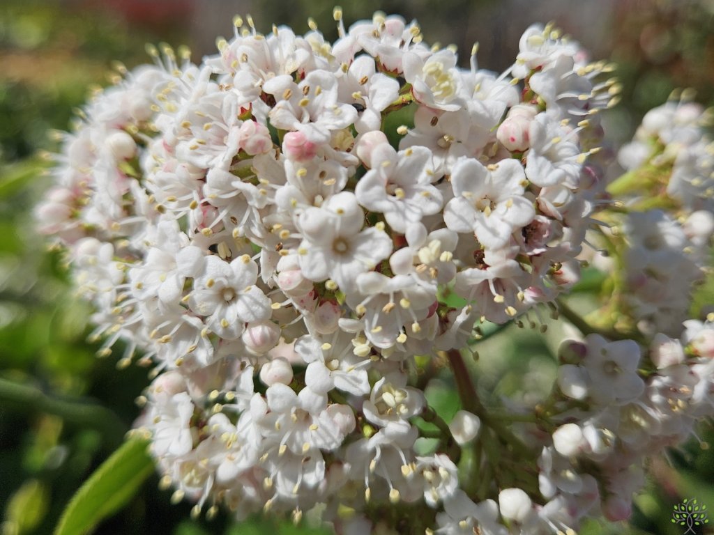 Schwarzer Holunder 'Lisarose'® - syn. Lorbeer-Schneeball. Immergrüner Strauch mit eleganten dunkelgrünen, glänzenden Blättern, die den Garten das ganze Jahr über schmücken. Ihre größte Zierde sind die rosa Knospen, die sich im Winter und frühen Frühling allmählich zu zarten weiß-rosa Blüten öffnen. Dieser dichte und kompakte Strauch erreicht eine Höhe von 1,5 bis 2 Metern und eine Breite von etwa 1,2 bis 1,5 Metern. Er ist pflegeleicht, verträgt Rückschnitte gut und eignet sich dank seiner Frostbeständigkeit auch für unsere Verhältnisse. Falls die Blüten nicht erfrieren, erscheinen kleine Früchte, die nicht essbar sind. Sie haben eine blaue Färbung mit deutlicher Bereifung. Er kommt als Solitär, in Hecken oder in Kombination mit anderen Ziergehölzen hervorragend zur Geltung.