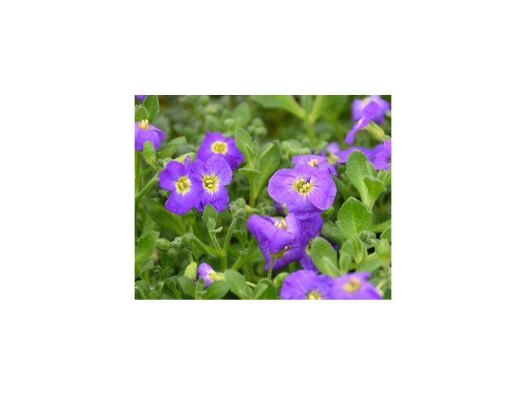 Auba 'Audrey Deep Blue Shades' - eine niedrig wachsende Staude, erreicht eine Höhe von 10 cm. Sie hat eine kompakte Form. Die Blätter sind löffelförmig, zart und frischgrün. Sie blüht im April und Mai, hat schöne violett-blaue Blüten, die etwa 1 cm groß und meist vierzählig sind. Sie bildet luftige und dichte Polster.
