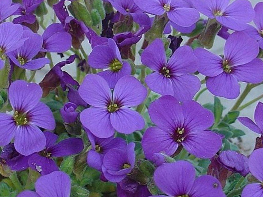 Aubrieta x cultorum 'Silberrand' - Die Aubrieta bildet niedrige, dichte und kompakte Polster mit schönem graugrünem Laub. Zur Blütezeit im April und Mai sind die Pflanzen vollständig mit Trauben von kleinen, einfachen oder gefüllten Blüten bedeckt. In diesem Fall handelt es sich um blauviolette Blüten. Er wächst bis zu einer Höhe von 15 cm. Am besten gedeiht sie an einem sonnigen Standort in durchlässiger, nährstoffreicher Erde mit ausreichend Kalk. Sie bedeckt gut felsige Bereiche, Dachgärten und Mauern.