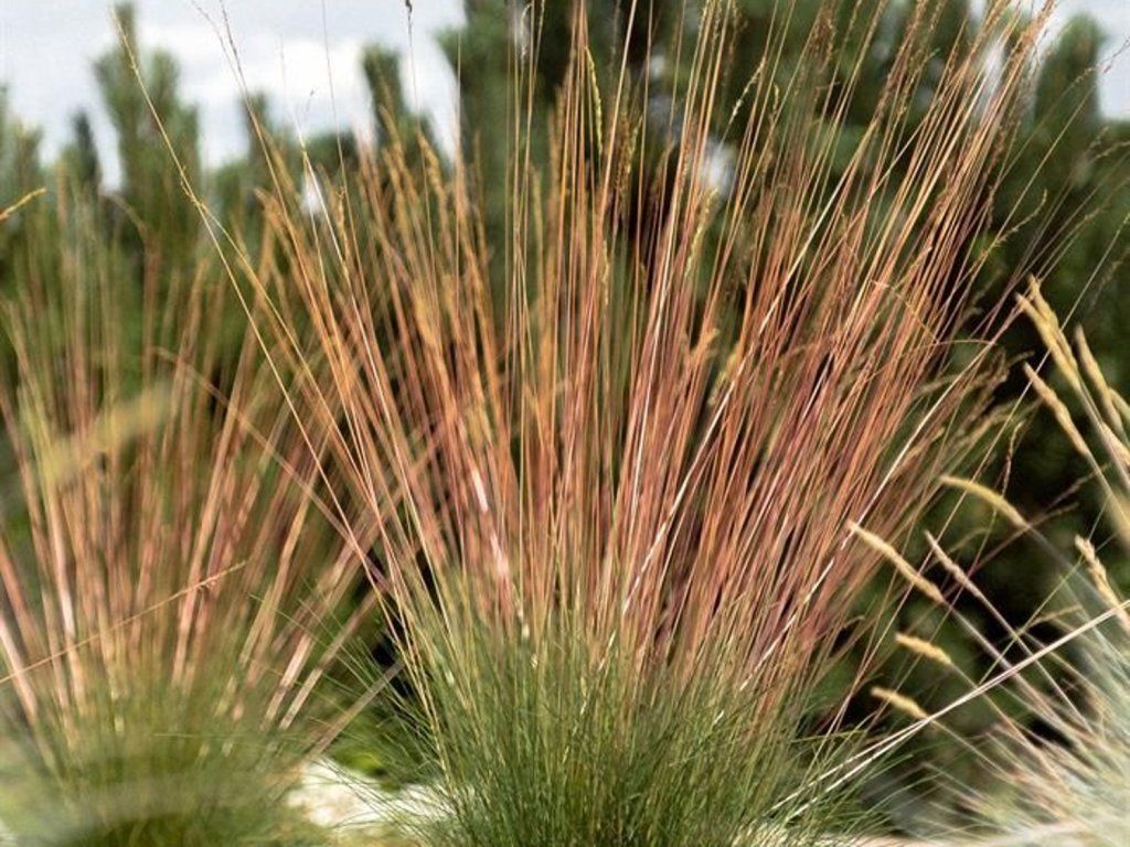 Schwingel 'Sunrise' - eine attraktive Sorte, die vor allem durch ihren feinen, kompakten Horst aus schmalen Blättern mit ungewöhnlicher Färbung besticht. Seine Blätter sind blau-grau bis silbrig-grün und können auf einem sonnigen Standort einen gelblichen Schimmer annehmen, was der Pflanze ein frisches und klares Aussehen verleiht, besonders im Morgenlicht, woher wahrscheinlich auch ihr Name stammt. Sie bildet niedrige, kissenförmige Horste mit einer Höhe von etwa 15–25 cm, die das ganze Jahr über sehr dekorativ wirken. In den Sommermonaten blüht sie mit feinen Ähren an schlanken Stielen, die die Blattrosette leicht überragen. Sie eignet sich für trockene Staudenbeete, Steingärten, Kübel und Wegränder, wo sie als Solitär wie auch in größeren Gruppen hervorsticht. Dank ihrer Anspruchslosigkeit und Trockenheitsresistenz ist sie ein beliebtes Gras in modernen und naturnahen Pflanzungen.