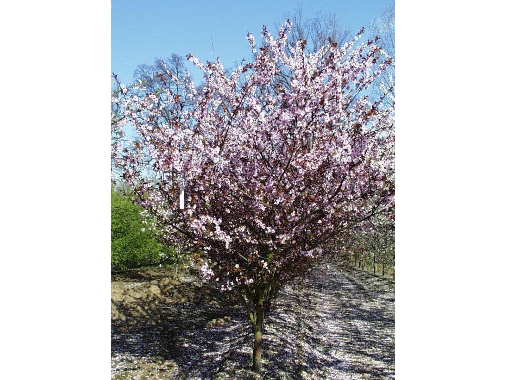 Blutpflaume - ein Zierbaum, der eine Höhe von etwa 12 m erreicht. Er zeichnet sich durch eine rote Blattfärbung aus, die sich im Laufe der Zeit zu Grün verändert. Die Blätter sind gestielt, eiförmig, am Rand gesägt und an der Spitze spitz. Von April bis Mai erscheinen halbgefüllte, süßrosa Blüten. Dieser bezaubernde Baum sollte in keinem Garten fehlen.