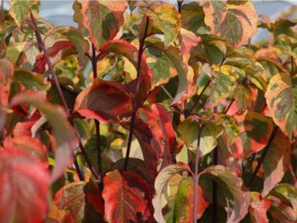 Blutendes Herz 'Rainbow' - die strahlendste und farblich wohl variabelste Sorte, die als natürliche Mutation in den USA entdeckt wurde, macht ihrem Namen zu jeder Jahreszeit alle Ehre. Sein Habitus ist vasenartig, sehr ordentlich und kompakt, und im Erwachsenenalter bildet er einen etagenförmig aufgebauten Strauch oder einen kleineren Baum, der eine Höhe von etwa 2,5 bis 3,5 Metern erreicht. Wächst mittelschnell und behält eine sehr harmonische Struktur bei. Die Blätter sind bei diesem Kultivar absolut dominant – sie sind tiefgrün mit einem breiten, unregelmäßigen und sehr hellen goldgelben Rand. Der ganze Strauch wirkt dadurch wie von der Sonne durchflutet, selbst bei bewölktem Wetter. Die herbstliche Verwandlung im Oktober ist atemberaubend, die Blätter beginnen sich in einer unglaublichen Farbpalette von Rosa über Scharlachrot bis zu tiefem Weinrot zu verfärben, wobei die gelben Ränder oft in leuchtendes Orange übergehen. Die Blüten erscheinen im April und Mai noch vor dem vollen Laubaustrieb und bestehen aus vier großen, reinweißen Hochblättern mit abgerundeten Enden und typischen kleinen Einkerbungen an den Spitzen. Vor dem Hintergrund der austreibenden bunten Blätter wirken die weißen Blüten sehr frisch und rein. Im September und Oktober reifen glänzende, tiefrote Früchte in eiförmiger Gestalt, die in kleinen Trauben die Zweige schmücken und Vögel anlocken. Diese Sorte kommt vor allem als auffälliger Solitär in kleineren Gärten, Atrien oder Vorgärten zum Einsatz. Dank ihrer bunten Belaubung ist sie die ideale Wahl, um Kompositionen mit dunklen Nadelgehölzen aufzuhellen oder um einen farblichen Blickpunkt im Garten zu schaffen. Sie ist einer der beliebtesten Kultivare wegen ihrer Fähigkeit, ihre Farbe das ganze Jahr über zu wechseln.