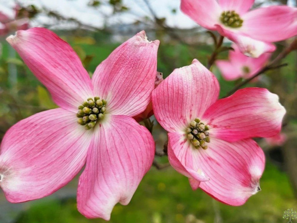 Der Blumenhartriegel ist eine prächtige Pflanze aus den östlichen Regionen Nordamerikas, eines der schönsten, sehr reich blühenden Ziergehölze. Seine elegante Erscheinung, die eine Höhe von 5–10 Metern und eine Breite von 4–8 Metern erreicht, bringt eine wunderbare Dimension in den Garten oder die Landschaftsgestaltung. Die ovale bis kugelförmige Kronenform bildet die Grundlage für eine reiche Palette an Herbsttönen, von feurigem Rot und Orange bis hin zu zarten Purpurtönen der Blätter. Seine Blätter allein sind schon wunderschön; mit ihrer länglichen ovalen Form und den ausgeprägten Adern, die die tiefgrüne Farbe unterstreichen, zeugen sie von natürlicher Eleganz. Aber das eigentliche Juwel sind die Blüten. Diese großen, bezaubernden Blüten mit weißen oder rosa Blütenblättern stellen ein Kunstwerk der Natur dar und schaffen eine fesselnde Frühlingsatmosphäre. Sie erscheinen vor dem Austreiben der Blätter und bleiben sehr lange am Strauch. Den Ziereffekt erzielen eigentlich die auffälligen, weiß bis zartrosa gefärbten Hochblätter. Bis die eigentliche, eher unscheinbare Blüte erscheint, wachsen die Hochblätter weiter und können bei einigen Sorten beeindruckende Ausmaße erreichen. Mit ihrer Präsenz bringt sie Charme, den Zauber der Frühlingsblüten und Herbstfarben in jeden Raum, was ihr Bewunderung und Interesse von Menschen garantiert, die diese unvergessliche Palette natürlicher Schönheit zu schätzen wissen.
