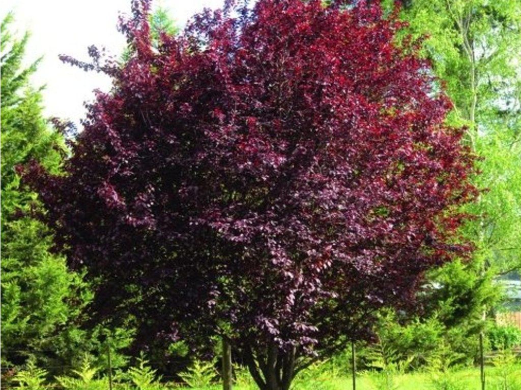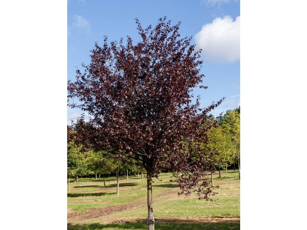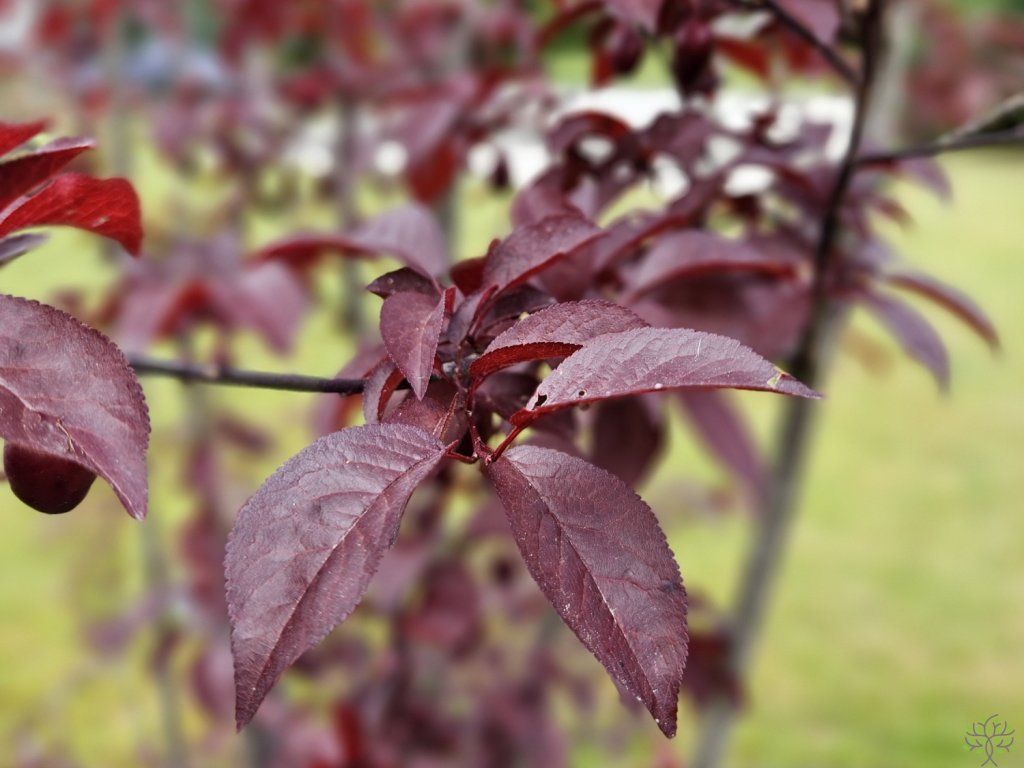 Myrobalanenpflaume 'Nigra' - sehr dekorative Zierpflaume, geschätzt für ihre dunkelpurpurnen Blätter und frühen rosa Blüten, die noch vor dem Laubaustrieb erscheinen. Sie gehört zu den beliebtesten Zierhölzern für Stadtgärten, Parks und Privatgärten, dank ihrer Widerstandsfähigkeit und ihres markanten Aussehens. Sie wächst als mittelgroßer Baum oder größerer Strauch, normalerweise 4 bis 6 Meter hoch, mit einer breit ausladenden, leicht unregelmäßigen Krone. Die Äste sind dunkel, gerade und die Pflanze behält das ganze Jahr über eine attraktive Silhouette. Die Blüten erscheinen sehr früh im Frühling, normalerweise im März bis April, oft noch vor dem Laubaustrieb. Sie sind hellrosa bis rosafarben-weiß, einfach, kleiner, aber in großer Zahl. Die Blüte ist reich und früh, was diese Sorte zum ersten auffälligen Frühlingsmerkmal im Garten macht. Die Blätter sind der Hauptanziehungspunkt. Sie haben eine dunkelviolette bis fast schwarze Farbe, die sie während der gesamten Saison, auch bei voller Sonne, gut beibehalten. Im Herbst gehen sie in Rottöne über. Früchte können erscheinen, sind aber klein und eher unauffällig; sie sind nicht das Hauptziel des Anbaus. Sie ist voll frosthart, verträgt Trockenheit und städtische Umgebungen gut. Sie eignet sich als Solitärpflanze, für Alleen, an Gehwegen, in Vorgärten oder als auffälliges Kontrastelement zu grünblättrigen Gehölzen. Sie lässt sich gut mit Zieräpfeln, Ahornen oder goldenen Nadelgehölzen kombinieren.