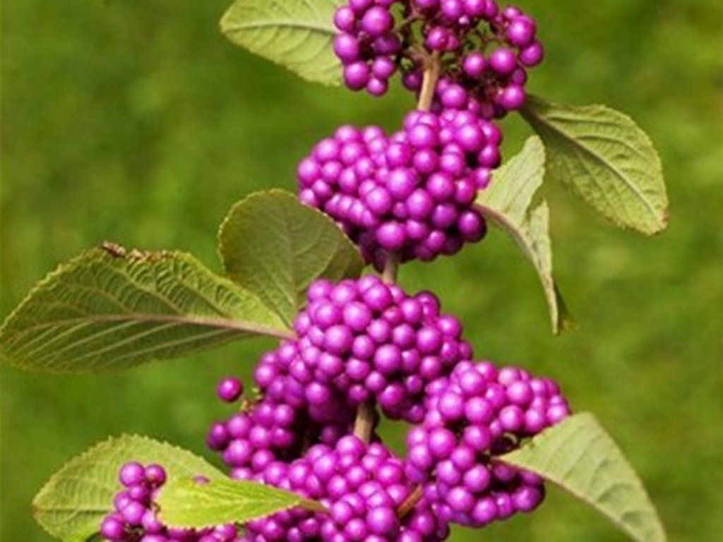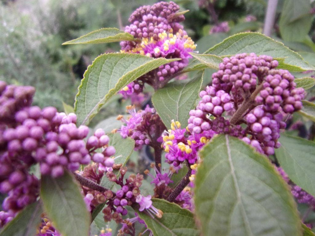 Schönfrucht Bodinier 'Imperial Pearl®' - ein halb-laubabwerfender Strauch mit buschigem Habitus, der eine Höhe und Breite von 100 - 200 cm erreicht. Aufrechte Zweige tragen im Juni und Juli eine beträchtliche Menge an tiefvioletten Blüten, gefolgt von leuchtend violetten Beeren. Die Blätter sind hellgrün, groß und eiförmig. Im Herbst färben sie sich orange. Nach ihrem Abfallen schmückt der Strauch bis etwa Dezember weiterhin reiche Beerenbüschel. Die Anpflanzung von zwei oder mehr Pflanzen sorgt für wirklich reiche Fruchtbildung. Hervorragend als Solitärelement für jeden Garten.
