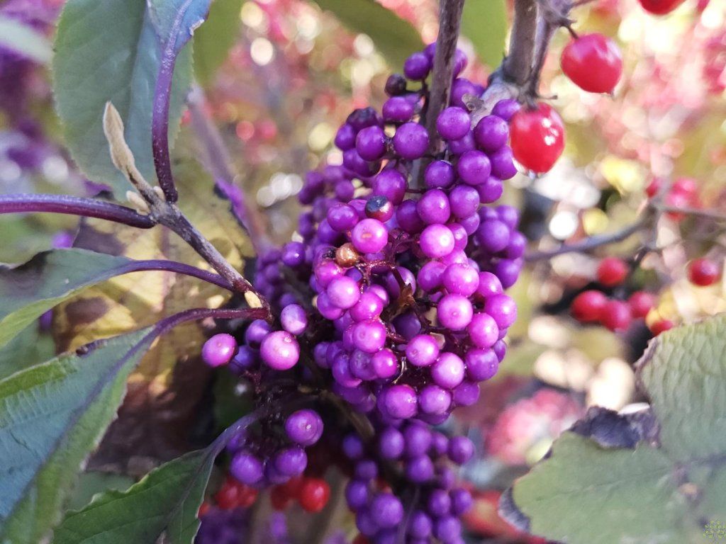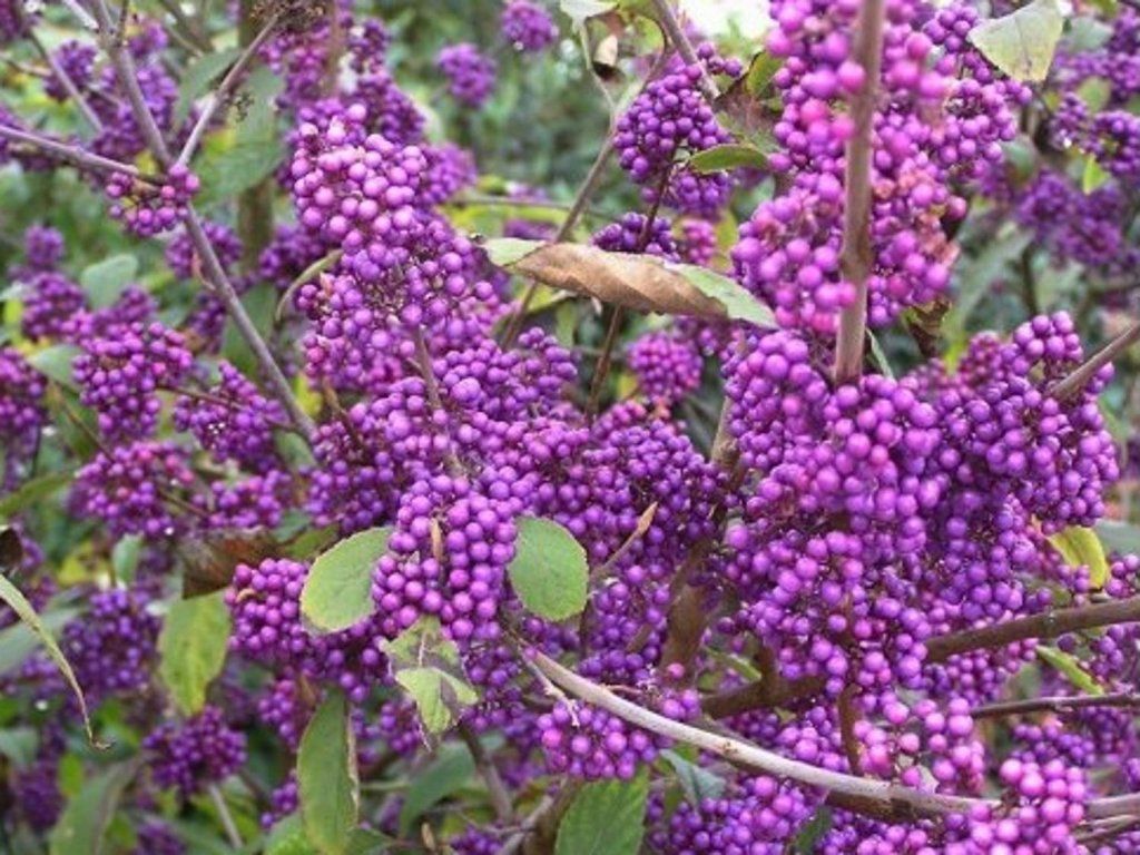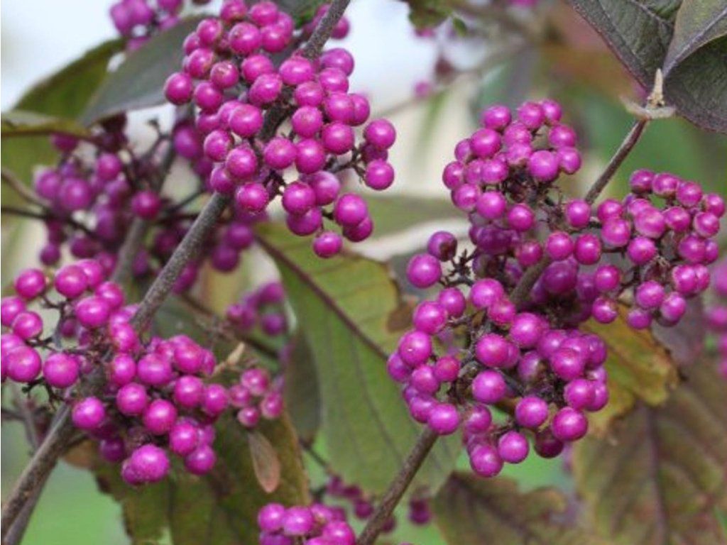 Schönfrucht Bodinier 'Profusion' - ein laubabwerfender Strauch, der ursprünglich aus chinesischen Provinzen stammt, wo er in Gebüschen und lichten Wäldern wächst. In Gärten wird er wegen seiner ungewöhnlichen, leuchtend violetten Früchte angebaut, die die Zweige schmücken, wenn die meisten Gehölze bereits blattlos sind. Der Strauch bildet einen breit aufstrebenden Habitus, erreicht eine Höhe von etwa 1,5–2,5 m und eine ähnliche Breite, mit leicht gebogenen Zweigen. Die Blätter sind länglich-eiförmig, anfangs bronzefarben getönt, später tiefgrün und färben sich im Herbst gelb und gelb-orange. Im Juni und Juli erscheinen in den Blattachseln kleine violett-rosa Blüten, die Bienen und anderen Bestäubern Nektar bieten. Nach der Bestäubung bildet der Strauch dichte, kugelförmige Fruchtstände von etwa 4–5 mm Durchmesser, die ab September intensiv violett reifen und oft bis in den Winter an den Zweigen verbleiben. Die Früchte sind nicht zum menschlichen Verzehr bestimmt, sie haben einen bitter adstringierenden Geschmack, sind aber eine willkommene späte Nahrungsquelle für Vögel. Die Schönfrucht eignet sich als markanter Solitär im Rasen, in Gruppen mit anderen Sträuchern oder als Teil von lockeren Hecken. Sie wirkt gut in Kombination mit Ziergräsern, Hortensien oder Rosen, wo der Kontrast von violetten Kugeln und hellen Blüten im Herbst einen deutlichen Farbakzent setzt.