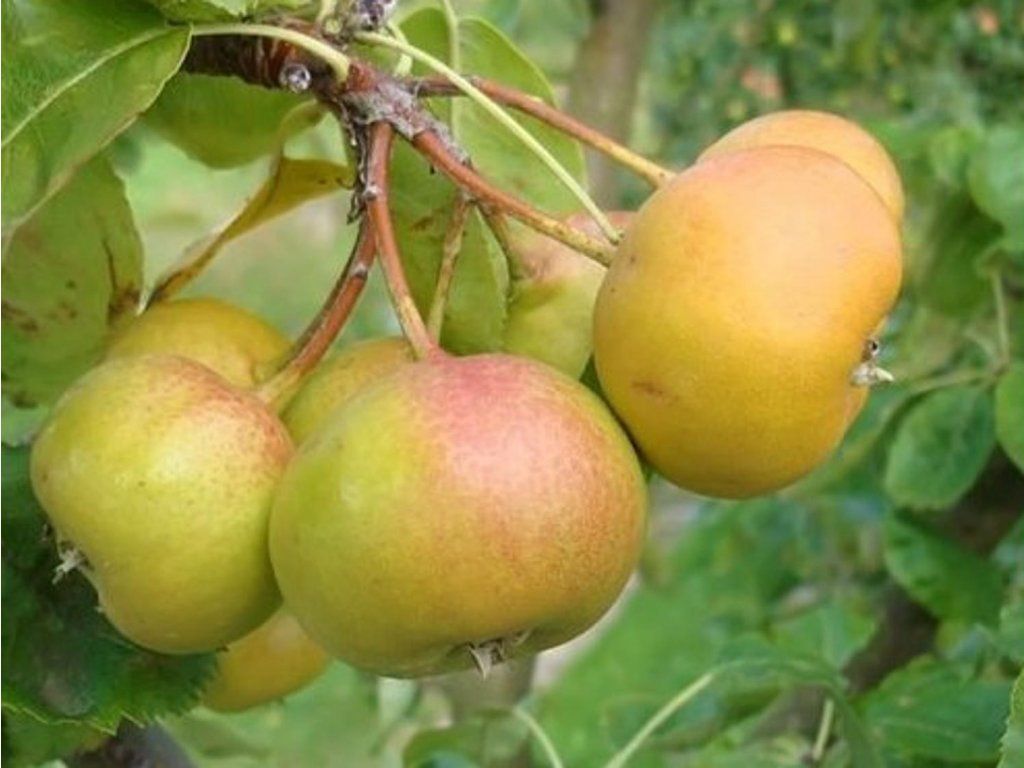 Ohrblättrige Eberesche-Birne - eine Kreuzung zwischen Birne und Eberesche. Als Baum erreicht er eine Höhe von bis zu 12 m, Sträucher bis zu 4–5 m. Er ist frostbeständig bis -30 °C. Er hat einen aufrechten, kegelförmigen Wuchs und wächst sehr üppig. Die Blätter werden bis zu 5 cm groß und ähneln in ihrer Form eher Apfelblättern als Birnenblättern. Im Herbst verfärben sich die Blätter braungelb bis rotgelb. Er blüht im Mai, und zwar sehr reichlich. Die Blüten sind weiß und selbstbestäubend. Aus diesen Blüten entwickeln sich später Früchte von bis zu 5 cm Größe. Die Früchte sind kugelförmige bis birnenförmige Kernobstfrüchte, die in einem reichen Fruchtstand an einem gemeinsamen Stiel gruppiert sind. Diese Kernobstfrüchte enthalten mehrere kleine Samen, die aber meist unterentwickelt sind und daher schlecht keimen. Diese Früchte sind im unreifen Zustand filzig und haben nach dem Reifen eine orange-rotgelbe Farbe. Die Früchte reifen Mitte September und haben einen sehr guten, angenehm süßen Geschmack. Leider hat er aufgrund der frühen Mehligkeit eine kurze Lagerfähigkeit.