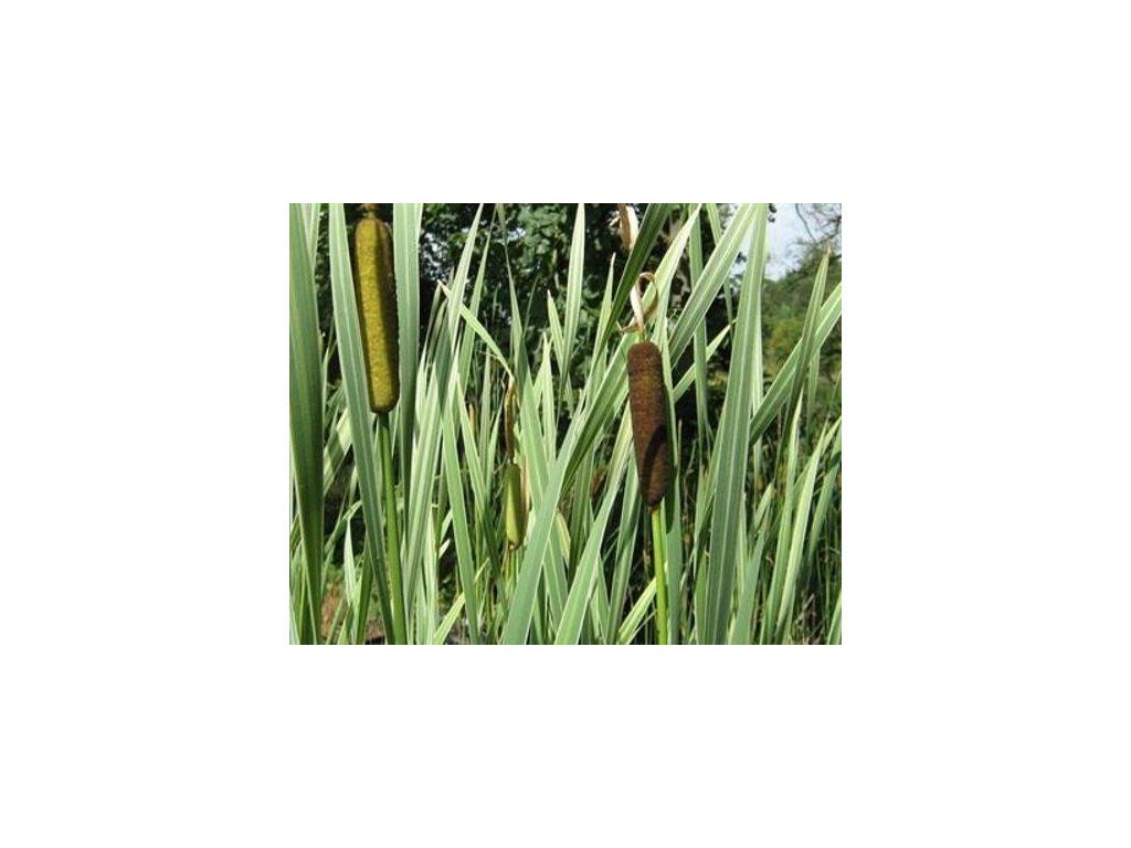 Breitblättriger Rohrkolben 'Variegata' - dekorative Sumpfpflanze, die bis zu 1,3 m hoch wird. Die Blätter sind lang, schmal, grün mit einer ausgeprägten cremeweißen Panaschierung. Von Juni bis Juli bildet sie typische braune Blütenkolben aus. Diese bleiben bis zum Winter an der Pflanze und eignen sich auch zum Schnitt. Die Pflanze bevorzugt sehr feuchte, sonnige Standorte und kann auch direkt ins Wasser bis zu einer Tiefe von max. 60 cm gepflanzt werden.