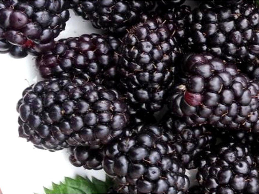 Brombeere 'Black Diamonds' - eine aufrecht wachsende Sorte von fast dornenlosen Brombeeren, die sich ideal für den Anbau im Topf auf Balkonen und Terrassen eignet. Die Triebe erreichen eine Höhe von 100 - 150 cm. Die Früchte reifen Ende Juni und Anfang Juli. Sie sind glänzend dunkelviolett bis schwarz, mittelgroß bis groß, kegelförmig mit einem Durchschnittsgewicht von ca. 5–6 Gramm, sie zerdrücken oder zerbröseln bei der Ernte nicht. Der Geschmack der Früchte ist süßlich, zart aromatisch mit leichter Säure und das Fruchtfleisch ist fester, was eine gute Lagerung, Transport und Verarbeitung ermöglicht. Sie eignen sich für den direkten Verzehr, zum Einfrieren, Einmachen und für Desserts. Dank ihrer gleichmäßigen Größe, des festen Fruchtfleisches und der guten Haltbarkeit gehört sie zu den geschätzten Sorten für Hausgärten und Kübel und wird oft empfohlen. Die Sorte ist gut frosthart, leidet nicht unter Krankheiten.
