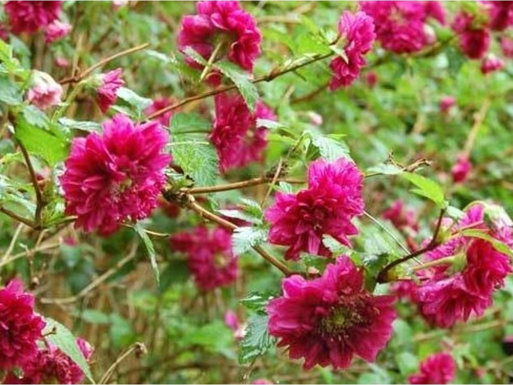 Prächtige Brombeere 'Olympic Double' - eine Brombeere, die hauptsächlich wegen ihrer sehr dekorativen Blüten angebaut wird. Ein Strauch, der eine Höhe von 150 - 200 cm erreicht. Die Blüten sind wunderschön gefüllt und strahlen buchstäblich in einem dunkelrosa bis fuchsiafarbenen Ton, was bei Brombeeren etwas noch nie Dagewesenes ist. Auch hier werden Sie Früchte tragen. Im Sommer reifen die Früchte, sie sind kleiner als bei klassischen Brombeeren und haben eine dunkelrote Färbung.