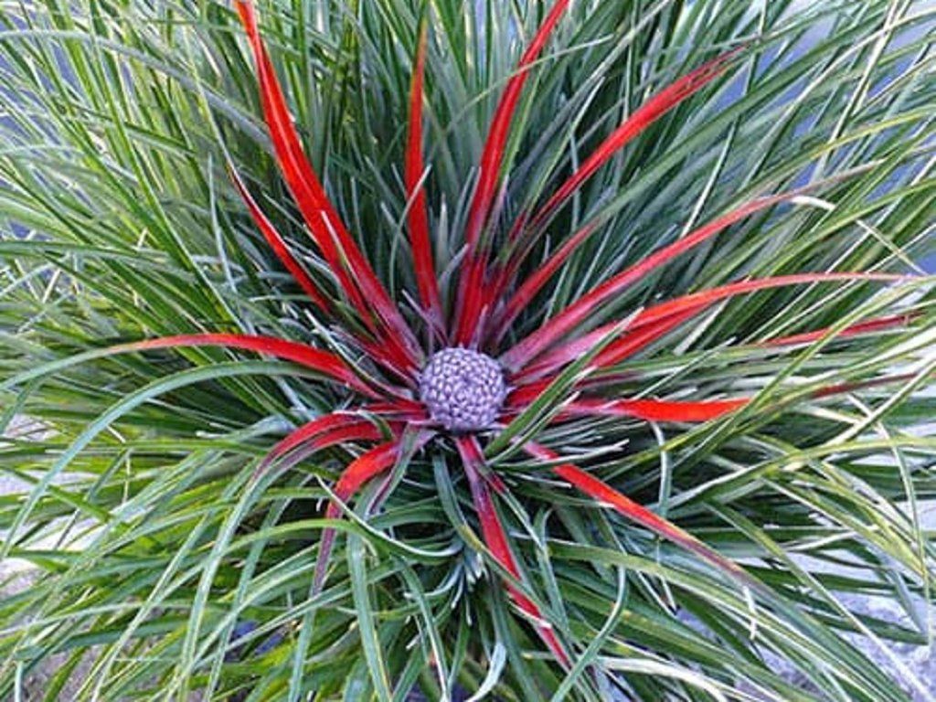 Bromelie fascicularia 'Bicolor' - Außen-Bromelie - eine Außen-Bromelie, die wir als eine der wenigen erfolgreich in unseren Gärten anbauen können. Sie bildet bis zu 60 cm hohe Rosetten aus langen und schmalen, ledrigen Blättern. Diese sind am Rand der Pflanze grün gefärbt, gehen aber in der Mitte in ein leuchtendes Rot über. Von August bis Oktober werden sie durch auffällige blau-violette Blüten ergänzt, die einen perfekten Kontrast bilden.