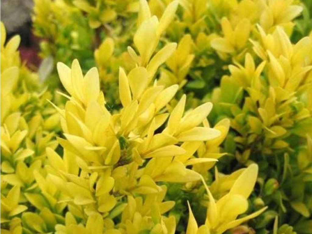 Buchsbaum 'King Midas' - sehr schöner gelblaubiger Kultivar. Der Buchsbaum ist ein immergrüner Strauch, der langsamer wächst. Dieser spezielle Kultivar erreicht eine Höhe von 50 - 100 cm. Die Blätter sind ledrig, mittelgroß und haben eine frische grün-gelbe Farbe, die strahlt. Die Pflanze eignet sich für niedrige Hecken, in diesem Fall wird ein Abstand von ca. 30 cm empfohlen. Sie ist vollständig frostbeständig.