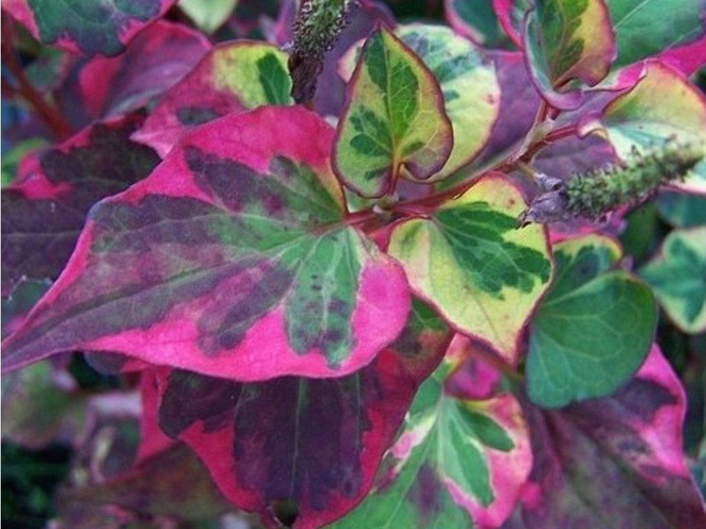 Houttuynia cordata 'Chameleon' - eine sehr schöne Bodendeckerpflanze, die aus Ostasien stammt und dort feuchte Standorte an Waldrändern, an Ufern von Bächen und in flachen Tümpeln besiedelt. Es ist eine Rhizomstaude aus der Familie der Saururaceae, die in wärmeren Regionen auch als Kraut angebaut wird. Der Kultivar 'Chameleon' wird für seine variabel panaschierten Blätter geschätzt. Die Blattspreiten sind breit herzförmig, im Austrieb gelbgrün, im Sommer mit cremefarbener Marmorierung und roten bis rosafarbenen Tönungen, besonders in der Sonne und im Herbst. Der Bewuchs erreicht normalerweise eine Höhe von 20–30 cm, bei ausreichender Feuchtigkeit kann er etwas höher sein, und breitet sich über die Rhizome oft auf eine Breite von 60–100 cm aus. Die Blätter haben eine glatte Oberfläche und eine deutliche Blattaderung und bilden in dichtem Bewuchs eine zusammenhängende, aber luftige Bodenbedeckung. Die Blütenstände sind unauffällig, von Juni bis August erscheinen über den Blättern kleine Ähren mit gelblichem Zentrum und vier weißen Hochblättern. Das Kraut ist aromatisch und kann nach dem Zerreiben einen würzigen bis „fischigen“ Duft haben, der für die Art typisch ist. Im Garten wird sie als Bodendecker am Teich, in feuchteren Halbschattenbereichen und in Gefäßen eingesetzt, wo das Wachstum besser kontrolliert werden kann. Sie bildet einen schönen Kontrast zu Farnen, Prachtspieren, Funkien und Gräsern am Wasser, wo die bunten Blätter wie gestreutes Licht zwischen dem Grün wirken.