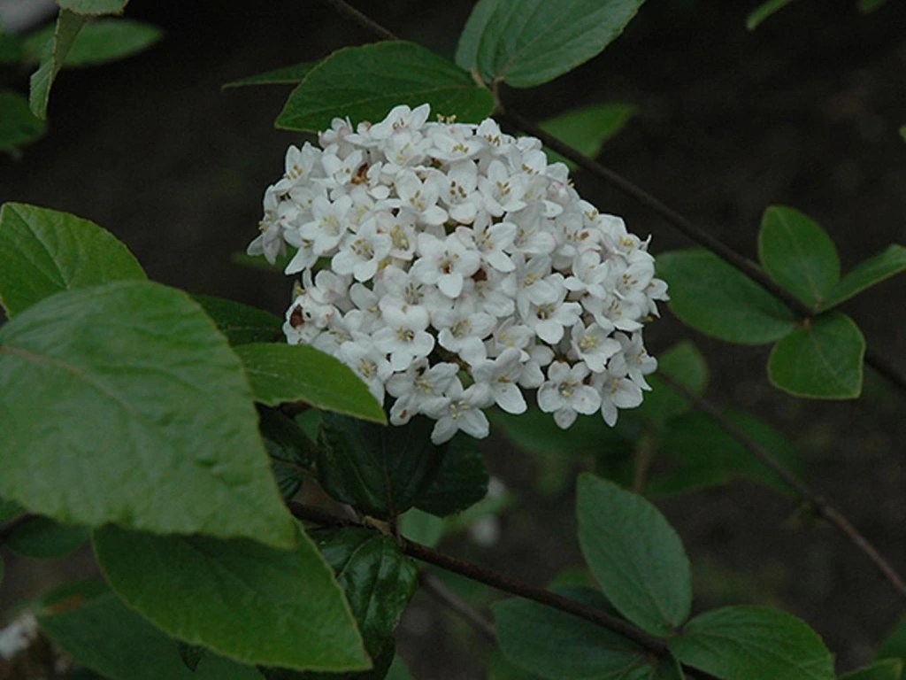 Viburnum x burkwoodii 'Chenaultii' - eine Sorte mit glänzenden, dunkelgrünen Blättern, die kleiner sind und eine feinere Textur aufweisen. Fein strukturierte Zweige verleihen dem Strauch ein feineres Aussehen. Die Knospen sind leicht rosa und wirken fast weiß. Aromatische Blüten bedecken den Strauch sehr reichlich. Aus den Blüten entwickeln sich allmählich rote Früchte, die allmählich schwarz werden. Er erreicht eine Höhe von etwa 1,5 m.