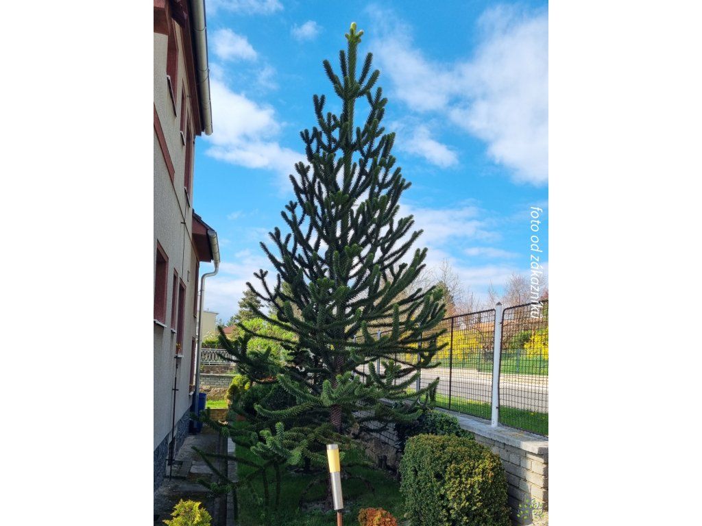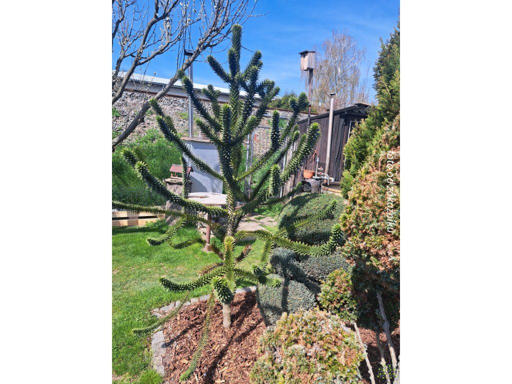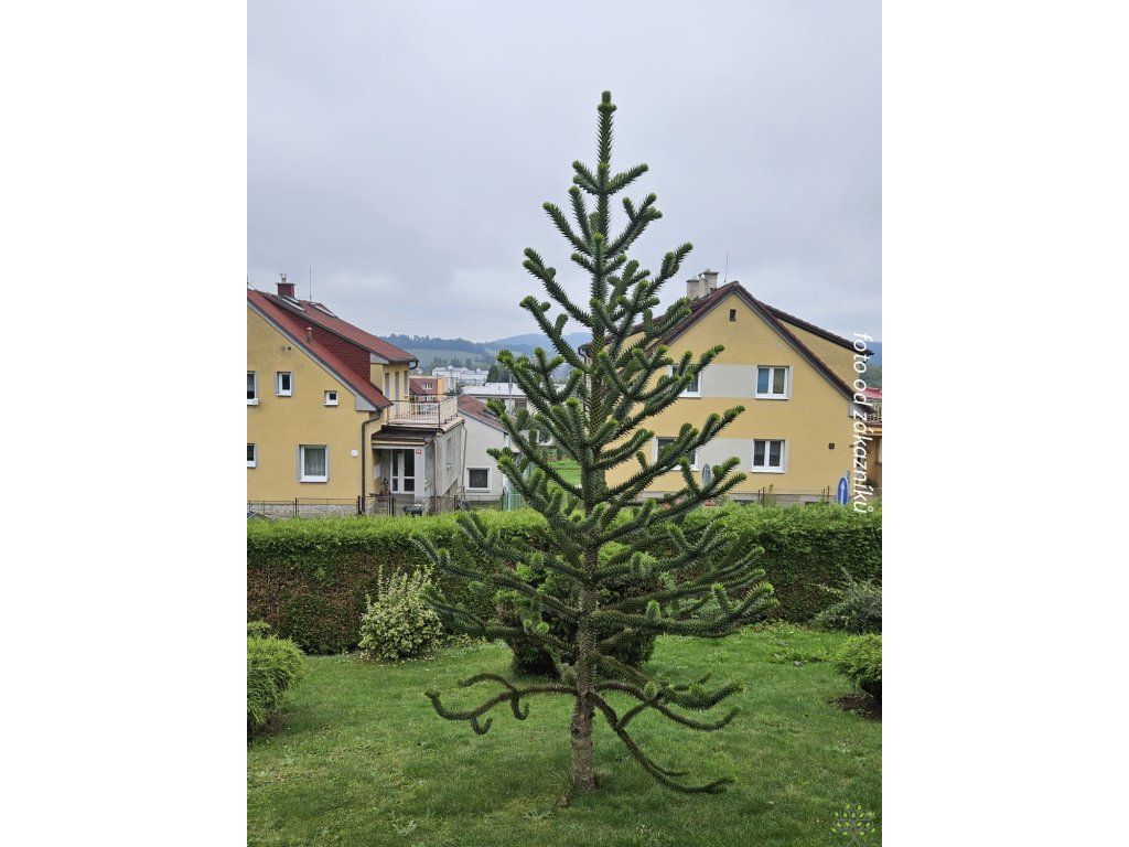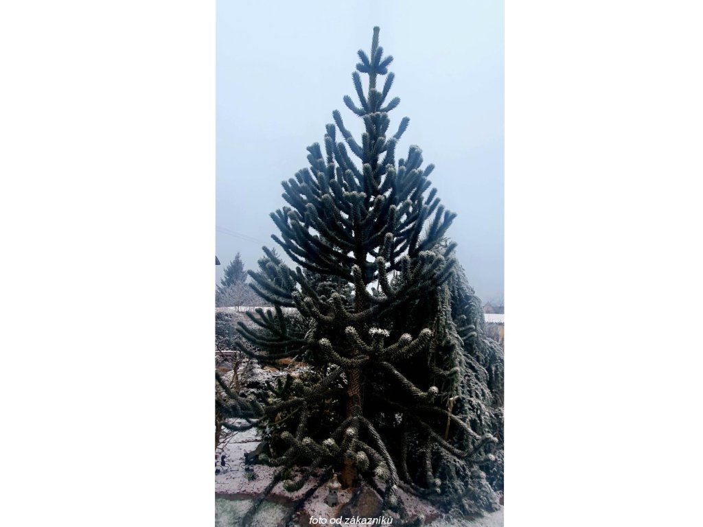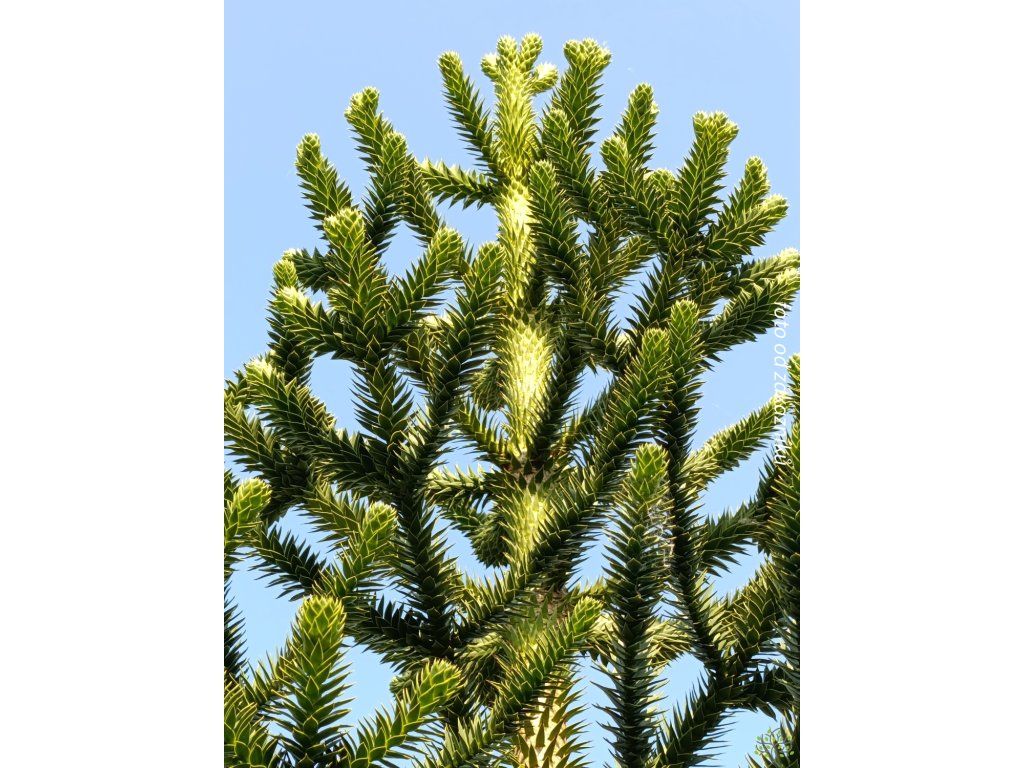 Chilenische Schmucktanne - eine ungewöhnliche Nadelbaumart aus der Familie der Araukariengewächse, ursprünglich aus den südamerikanischen Anden in Chile und Argentinien. In der Natur wächst sie auf felsigen, oft vulkanischen Hängen, wo das Wasser nach Regenfällen schnell abfließt. Sie bildet eine unverwechselbare „treppenartige“ Verzweigung mit steifen, dreieckigen Blättern, die sich bei Berührung stachelig anfühlen und in einer dichten Mosaik auf den Ästen sitzen. Junge Bäume sind meist kegelförmig, mit zunehmendem Alter werden Stamm und Astetagen deutlicher ausgeprägt und die Silhouette erhält einen skulpturalen Charakter. In unseren Gärten eignet sie sich als Solitärpflanze, die langsamer wächst, aber durch ihre Langlebigkeit einen schnellen Effekt ersetzt. In ausgewachsenem Zustand erreicht er unter den Bedingungen der Tschechischen Republik normalerweise eine Höhe von 12–18 m und eine Breite von 6–10 m, in wärmeren und geschützten Lagen kann er auch höher sein. Die Art ist zweihäusig, männliche und weibliche Individuen unterscheiden sich durch die Bildung von Zapfen. Bei weiblichen Bäumen reifen große kugelförmige Zapfen mit Samen, die in ihrer Heimat essbar sind und als Piñones bekannt sind. Im Garten erscheinen die Früchte jedoch nur bei Bestäubung durch ein männliches Individuum in der Nähe und nach mehreren Jahren des Anbaus. Das stachelige Laubwerk eignet sich eher für Standorte abseits frequentierter Wege. In der Komposition passt er gut zu Gräsern und Heidekräutern oder als Kontrast zu gewöhnlichen Nadelbäumen, wo seine Silhouette das ganze Jahr über wie ein grünes Relief wirkt.