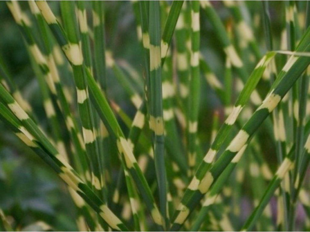 Chinesisches Lampenputzergras 'Little Zebra' - eine kompakte Sorte des sogenannten Zebra-Lampenputzergrases, gezüchtet Anfang des 21. Jahrhunderts als kleinere Alternative zu höheren gestreiften Formen. Die Art Miscanthus sinensis stammt aus Ostasien, wo sie auf sonnigen Wiesen und Hängen mit leicht feuchtem, aber gut durchlässigem Boden wächst. Die Sorte 'Little Zebra' bildet dichte, anfangs aufrechte, später im oberen Teil leicht überhängende Horste. Im ausgewachsenen Zustand erreicht sie eine Höhe von ca. 100–130 cm und eine Breite von 60–80 cm, unter optimalen Bedingungen einschließlich der Blüte bis zu etwa 150 cm. Die Blätter sind schmal, dunkelgrün, mit unregelmäßigen horizontalen Streifen in cremefarbenem Gelb, die an ein Zebramuster erinnern und während der gesamten Vegetationsperiode deutlich sichtbar bleiben. Ende des Sommers erscheinen über den Blättern Rispen in weinroter bis purpurroter Farbe, die im Herbst allmählich zu cremefarbenen Beigetönen verblassen und den Winter über an der Pflanze verbleiben. Trockene Halme fangen Reif und Schnee ein und verleihen dem Garten in der Ruhephase eine feine vertikale Struktur. In kleineren Gärten wird die Sorte als Solitärpflanze an der Terrasse oder am Weg eingesetzt, in größeren Flächen funktioniert sie gut in rhythmischer Wiederholung in Prärie- und Steppenpflanzungen. Sie eignet sich auch für geräumigere Gefäße, wo sie einen Höhenakzent und Bewegung im Wind bringt. In gemischten Staudenbeeten lässt sie sich gut mit Sonnenhut, Fetthenne, Katzenminze oder anderen trockenheitsresistenten Stauden kombinieren, an Gewässern schafft sie einen sanften Übergang zwischen Ufer und Wasser.