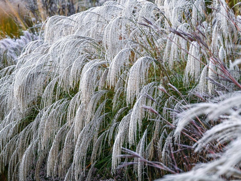 Chinaschilf 'Silver Charm' - attraktive, mittelhohe Zierschilf-Sorte mit zartem Aussehen und eleganten Blütenständen. Er erreicht eine Höhe von etwa 150 bis 180 cm und bildet dichte, aufrechte Horste aus schmalen grünen Blättern. Im Laufe des Sommers erscheinen auf langen Stielen leichte, silbrig-weiße Blütenstände, die einen sehr reinen Eindruck hinterlassen. Die Blüten bleiben auch in den Wintermonaten dekorativ und tragen zusätzlich zur räumlichen Struktur des Gartens bei. Sie ist voll frostbeständig und verträgt auch Trockenperioden gut. Mit ihrem zarten, aber auffälligen Aussehen eignet sie sich für moderne und naturnahe Pflanzungen, wo sie als Solitär oder in Gruppen mit anderen Ziergräsern und Stauden zur Geltung kommt.