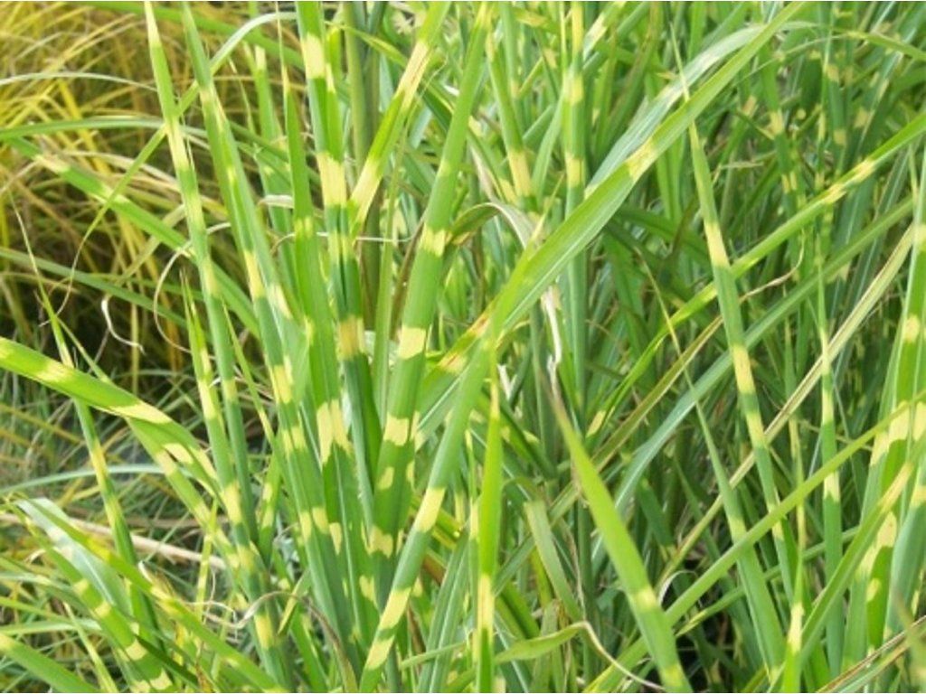 Chinesisches Reitgras 'Zebrinus' - eine ausdauernde Ziergraskultivar aus Ostasien. In Gärten bildet sie ausgeprägte, aufrechte und leicht fächerförmig ausgebreitete Horste, die sich unter guten Bedingungen im Laub etwa 1,5–1,8 m und in Blüte etwa 2 m Höhe erreichen, bei einer Breite von etwa 0,9–1,3 m. Die Blätter sind steif, mittelbreit, frischgrün, unregelmäßig waagerecht gestreift mit cremefarben-gelben Bändern, die der Pflanze ein typisches zebraartiges Aussehen verleihen. Die Streifen kommen im Hochsommer am stärksten zur Geltung, wenn die Blattmasse voll entwickelt ist. Ende des Sommers, meist im August und September, kann sich über dem Laub ein feiner Blütenstand in Form von Rispen entwickeln, anfangs rosafarben-braun bis purpurfarben, später beige bis silbrig, der bis in den Winter hinein bestehen bleibt. In kälteren Regionen erscheinen die Blüten weniger regelmäßig, die Pflanze wirkt jedoch auch ohne sie als vollwertiges Solitärelement. Im Herbst vergilben die Blätter bis bronzefarben-braun und die trockenen Horste bleiben auch in den Wintermonaten dekorativ, wenn sie Raureif und Schnee auffangen. 'Zebrinus' findet als Solitär im Rasen sowie im hinteren Teil von gemischten Staudenbeeten Verwendung, wo es als Hintergrund für niedrigere Stauden wie Sonnenhut, Astern, Sedum oder Helenium dient, und bei der Pflanzung in größeren Gruppen als halbtransparente Blende entlang eines Zauns oder einer Terrasse fungiert.
