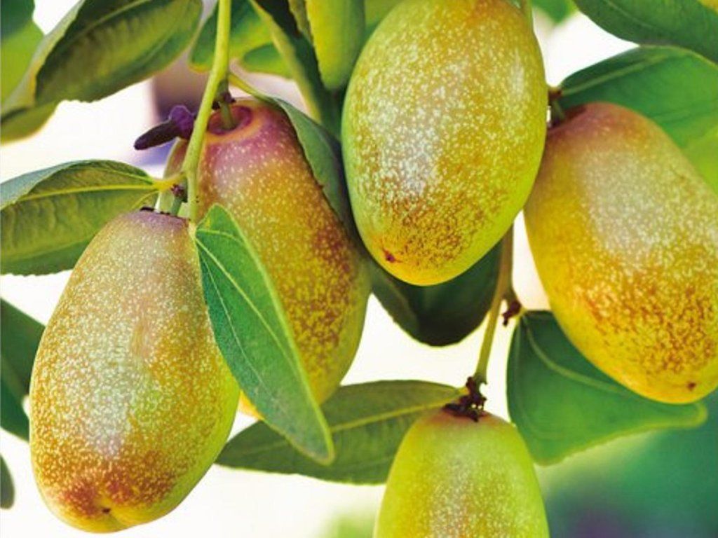 Chinesische Jujube ´Xuan Cheng Jian´ - exotischer, laubabwerfender Strauch, der eine Höhe von 3-4 m erreicht. Die Pflanze blüht im Frühsommer in Gelb. Die Blüten sind teilweise selbstfruchtbar. Zwischen September und Oktober ernten wir ovale Früchte mit fleischigem Fruchtfleisch von cremeweißer Farbe und ausgeprägtem, süßem Geschmack. Die Früchte selbst sind sehr reich an Vitaminen und Spurenelementen.