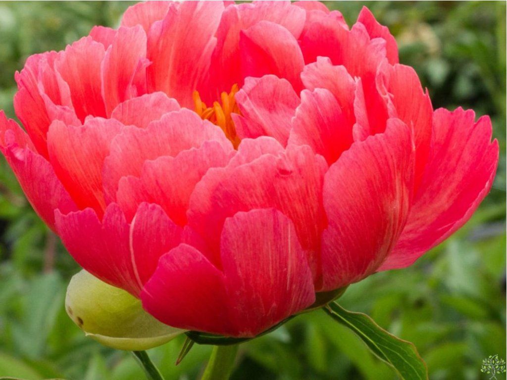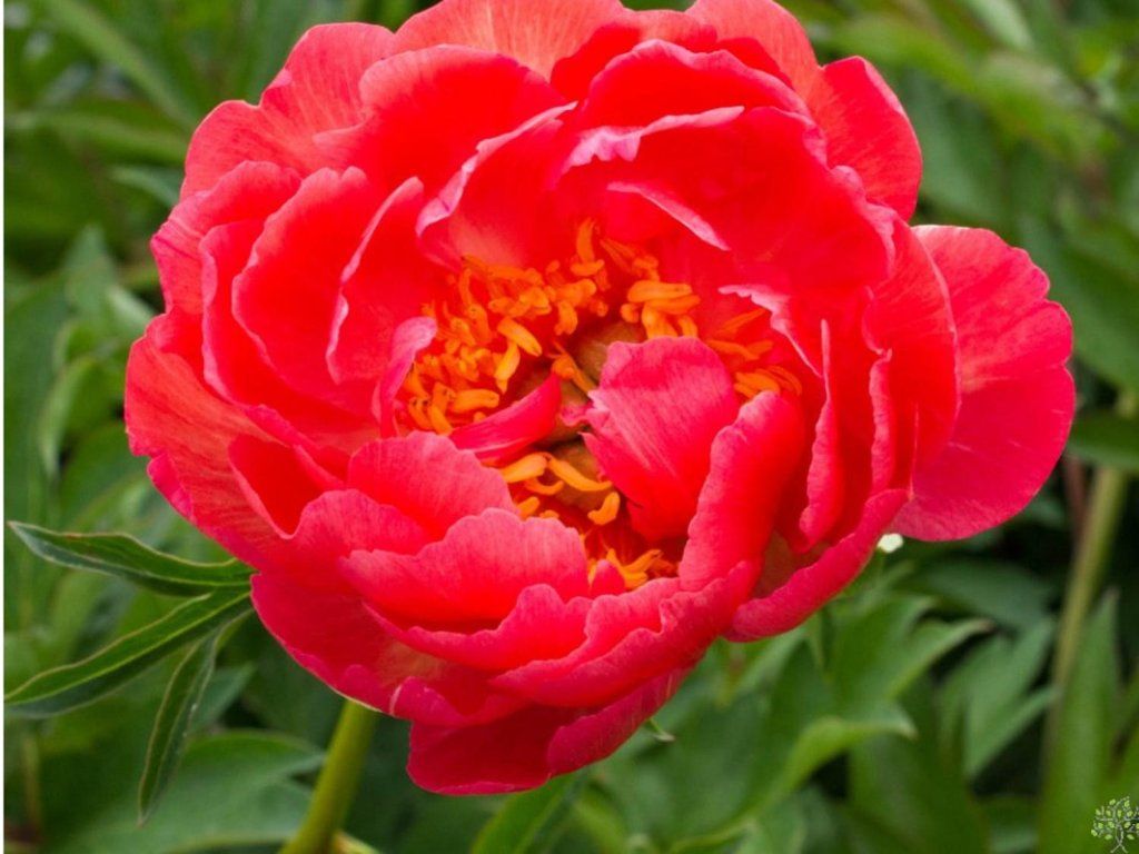 Chinesische Pfingstrose 'Coral Sunset' - eine wunderschöne, früh blühende Pfingstrose, die zu den früh blühenden „korallenfarbenen“ Kultivaren gehört, bei denen sich die Farbtöne innerhalb weniger Tage ändern. Die Sorte wurde vom amerikanischen Züchter Samuel E. Wissing gezüchtet, die erste Blüte wurde 1965 aufgezeichnet und die Registrierung erfolgte später durch Roy Klehm im Jahr 1981. Die Pflanze bildet einen dichten, aufrechten Horst von etwa 0,7–0,9 m Höhe und 0,8–1,0 m Breite, der normalerweise innerhalb von 2–5 Jahren seine volle Stärke erreicht. Die Blätter sind dunkelgrün, tief geteilt, im Frühling können sie einen bronzefarbenen Schimmer haben und behalten nach der Blüte bis zum Spätsommer die Struktur des Beetes. Ende Mai und Anfang Juni öffnen sich große, halbgefüllte, schalenförmige Blüten von 15–18 cm. Die Knospen sind korallenorange, die geöffneten Blüten sind lachsrosa-pfirsichfarben und verblassen allmählich zu cremefarben bis elfenbeinweiß, mit goldenen Staubgefäßen in der Mitte. Der Duft ist leicht bis schwach, aber die offene Mitte liefert Pollen für Bienen und andere Bestäuber. In Beetkombinationen bewährt sie sich mit Schwertlilien, Storchschnäbeln, Katzenminze, Salbei, Zierlauch und feinen Ziergräsern, wo die Korallentöne wie warmes Licht zwischen dem Grün wirken.