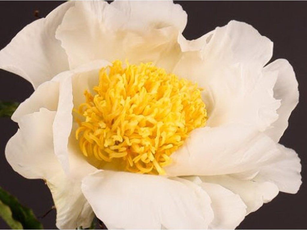 Pfingstrose 'Moon of Nippon' - klassischer Kultivar mit halbgefüllten Blüten. Erreicht eine Höhe von etwa 70 cm bei einer Breite von 60 - 90 cm. Die Blütenblätter haben eine reine weiße Farbe, das große Zentrum ist leuchtend gelb. So bietet sich uns ein sehr interessanter Farbkontrast. Die Blätter sind typischerweise geteilt, dunkelgrün. Mit dem Einsetzen des Herbstes nehmen die Blätter dann Farbtöne von Rot, Orange und Gelb an. Die Stängel sind kräftig und aufrecht, daher eignen sich die Blüten zum Schnitt.