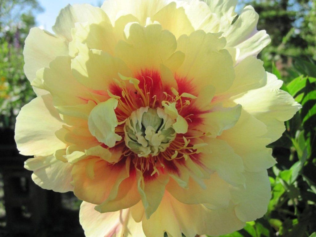 Chinesische Pfingstrose 'Prairie Charm' - Kkrautige Staude mit grünen, geteilten Blättern mit aufrechten Stielen und einem großen Blütenstand. Sie zeichnet sich durch mittelgroße, halbgefüllte, buttergelbe Blüten mit rötlichen Zentren aus. Die Blätter sind gelappt, dunkelgrün. Die Stängel sind kräftig und aufrecht, daher eignen sich die Blüten zum Schnitt. Blüht im Mai und Juni und erreicht eine Höhe von ca. 90 cm. Wirkt als wunderschöne Solitärpflanze.