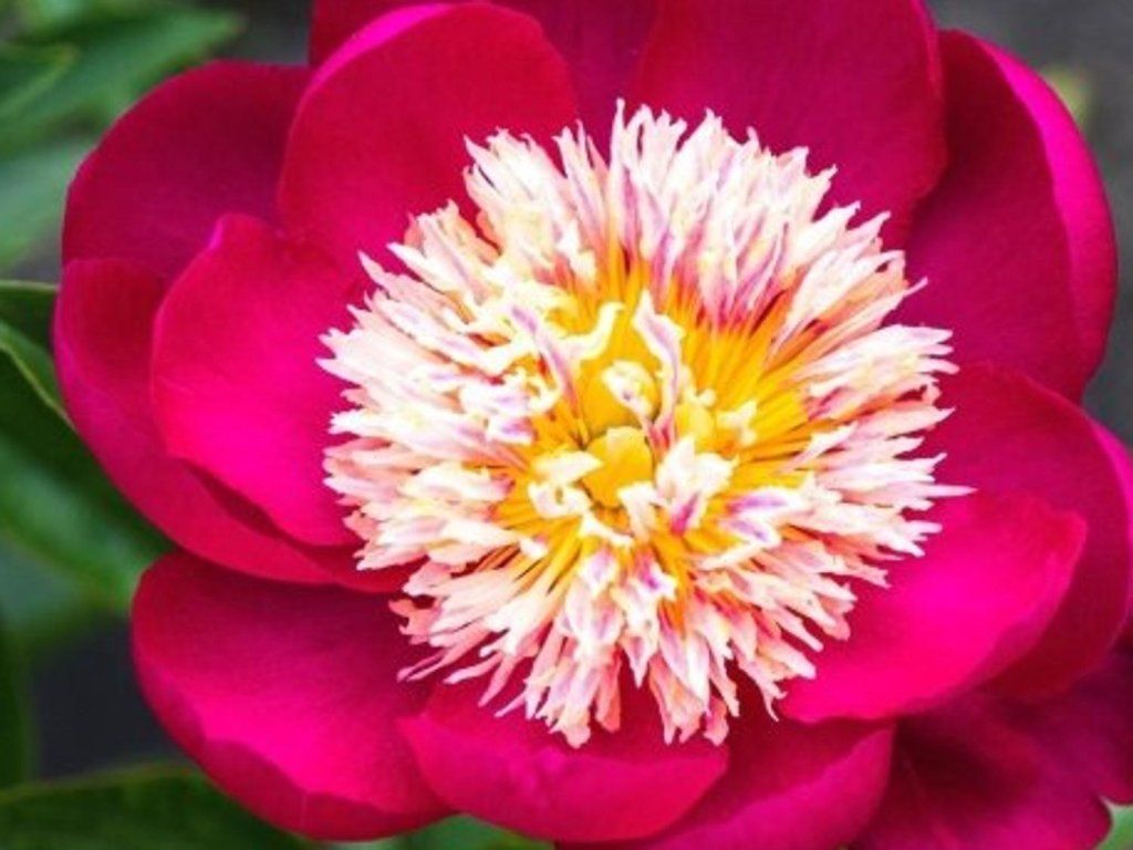 Pfingstrose 'Sword Dance' - Wunderschöne Pfingstrose, die bis zu 60 - 90 cm hoch wird. Sie bildet prächtige rosa Blüten mit einem Zentrum aus gelben und purpurnen Staubgefäßen, die luftig wirken. Der Farbkontrast ist sehr interessant und ungewöhnlich. Blüht ab Juni. Die Blätter sind typischerweise geteilt, dunkelgrün. Mit dem Einsetzen des Herbstes nehmen die Blätter dann Farbtöne von Rot, Orange und Gelb an. Die Stängel sind kräftig und aufrecht, daher eignen sich die Blüten zum Schnitt.