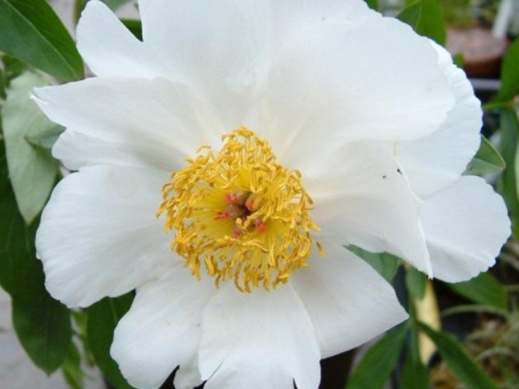 Chinesische Pfingstrose 'White Wings' - die Sorte 'White Wings' wurde 1949 in den Niederlanden eingeführt, am häufigsten wird die Einführung durch Hoogendoorn genannt. Sie bildet einen kompakten, buschigen Horst mit festen Stielen und dunkelgrünen, tief geteilten Blättern. Im Mai und Juni öffnen sich an den Stielspitzen sehr große, einfache Blüten, meist 14–18 cm, mit leicht gewelltem Blütenblattrand. Aus der Knospe können kurzzeitig zarte violette Streifen hervortreten, die schnell in ein reines Weiß übergehen. Die Mitte füllt eine Ansammlung goldgelber Staubgefäße, die die Sorte bienenfreundlich machen und sie luftiger wirken lassen als gefüllte Pfingstrosen. Ein zarter Blumenduft ist besonders an warmen Tagen wahrnehmbar. In der Komposition lässt sie sich gut mit Schwertlilien, Salbei, Rosen und Ziergräsern kombinieren, wobei die weiße Blüte die Farben der umliegenden Stauden hervorhebt. Wie bei anderen Pfingstrosen kann sie bei Verzehr für Haustiere reizend sein.