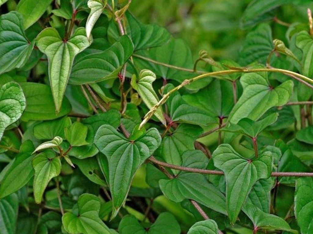 Chinesische Yamswurzel - die Pflanze stammt ursprünglich aus China und Japan. Unter der Erde bildet sie rötliche Knollen, die etwa 1 kg wiegen. Die Knollen sind sehr schmackhaft, wie Süßkartoffeln. Der Stängel ist rankend. Die Blätter sind groß, dunkelgrün, glänzend und herzförmig. Die Blüte ist klein, weiß und duftet angenehm nach Zimt, sie erscheint von Juni bis August. Sie windet sich schön an einer Rankhilfe und erreicht eine Höhe von 3,5 m.
