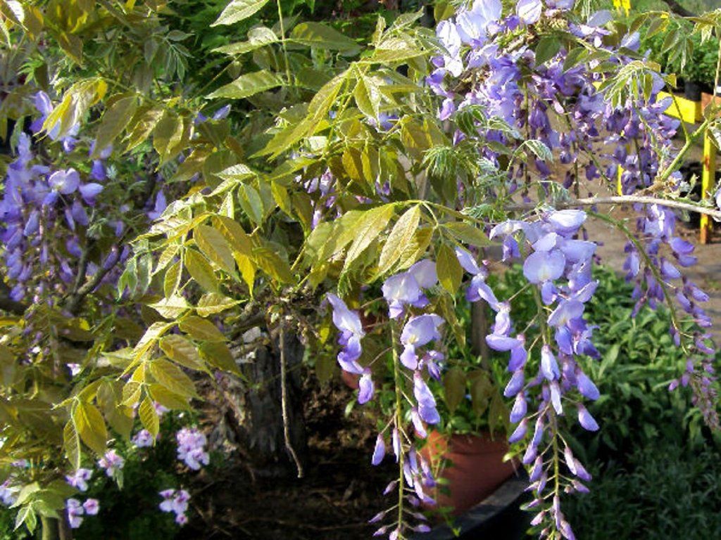 Anbau: Der Blauregen benötigt zum Wachsen eine starke Stütze, rechnen Sie damit, dass er in wenigen Jahren 10 Meter erreichen kann. Wir pflanzen an einem warmen und sonnigen Standort. In den ersten 2 bis 3 Jahren widmen wir der Glyzinie besondere Aufmerksamkeit, düngen und gießen regelmäßig, Mitte des Sommers ist es wichtig, mit Kaliumdünger zu düngen, damit das Gewebe im Herbst ausreifen kann. Für den Winter ist es ratsam, die Pflanze in den ersten Jahren mit Tannenzweigen abzudecken. Bei strengen Wintern kann sie erfrieren, aber sie treibt normalerweise wieder aus. Vor dem Pflanzen tauchen Sie den Topf mit der Pflanze in einen Behälter mit Wasser, bis er sich gründlich vollgesogen hat. Wir graben eine Grube mit den Maßen 40x40x40 cm, geben 10 cm gut verrotteten Mist oder Kompost auf den Boden und pflanzen. Wir pflanzen 1-2 cm tiefer, als sie ursprünglich stand. Pflanzen Sie mindestens 30 cm von der Wand oder einer anderen Pflanze entfernt. Schnitt: Glyzinien erfordern einen regelmäßigen Schnitt, ohne diesen begännen sie erst nach 15 Jahren zu blühen. Beim Pflanzen kürzen wir den Haupttrieb auf 50-70 cm, die Seitentriebe schneiden wir auf 3 Knospen zurück. Während der Vegetationsperiode, wenn die einjährigen Seitentriebe 25 cm erreichen, kneifen wir sie hinter dem 3. bis 4. Blatt ab (kürzere als 15 cm werden nicht gekürzt). Der Hauptjahrestrieb wird wachsen gelassen! Wenn die aus den seitlichen gekürzten einjährigen Trieben gewachsenen Triebe 25 cm erreichen, kneifen wir sie hinter dem 5. bis 6. Blatt ab, kürzere lassen wir stehen. Der Sommerschnitt wird noch zweimal wiederholt, wenn die abgekniffenen Triebe 15 bis 20 cm erreichen. Der Hauptjahrestrieb wird wachsen gelassen! Im zweiten Jahr im Frühjahr, wenn keine Fröste drohen, werden die im Vorjahr gewachsenen Triebe auf die 5. bis 6. Knospe zurückgeschnitten, kürzere Zweige werden nicht geschnitten. Der Endtrieb wird überhaupt nicht geschnitten. Während der Vegetationsperiode, wenn die einjährigen Seitentriebe 25 cm erreichen, werden sie nach dem 3. bis 4. Blatt eingekürzt. Dies wird wiederholt, wenn die Triebe 25 cm erreichen. Der Hauptjahrestrieb wird wachsen gelassen! Im dritten Jahr nach der Pflanzung sollten sich an den Seitenzweigen Blütenknospen am zweijährigen Holz der letztjährigen Triebe befinden. Wenn die verlängernden Triebe lang und kräftig sind, werden sie im Frühjahr auf die 5. bis 6. Knospe gekürzt, alle anderen unter dem Haupttrieb werden auf die 3. bis 4. Knospe gekürzt, kürzere und schwächere Triebe, die schräg und waagerecht wachsen, werden belassen, an diesen Zweigen bilden sich Blütenknospen. Im Sommer werden die Triebe, die 25 cm überschreiten, erneut abgekniffen. In den folgenden Jahren benötigt die Glyzinie normalerweise keinen Schnitt mehr, die erhöhte Bildung von blütentragenden Zweigen schwächt das Wachstum. Wenn der Endtrieb die gewünschte Höhe überschreitet, binden Sie ihn waagerecht. Bei älteren Pflanzen verhindern wir mit einem Erhaltungsschnitt lediglich unerwünschtes Wachstum.