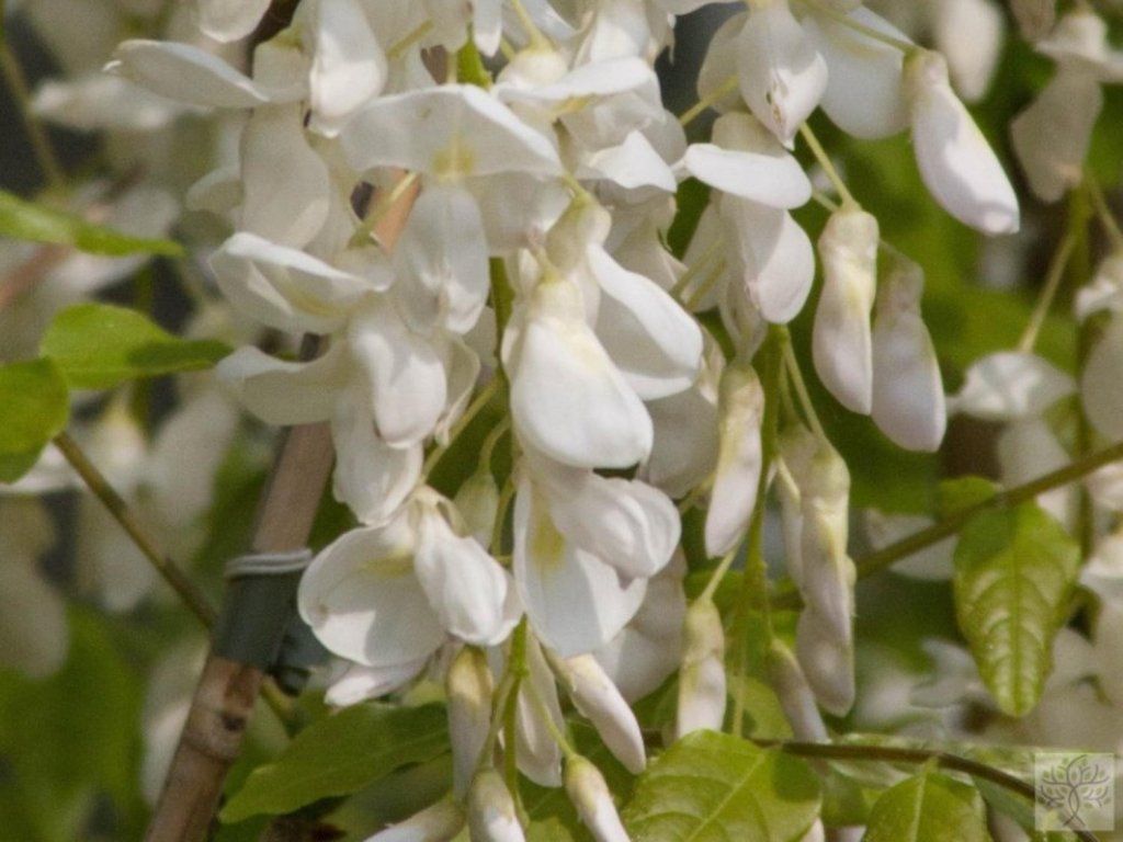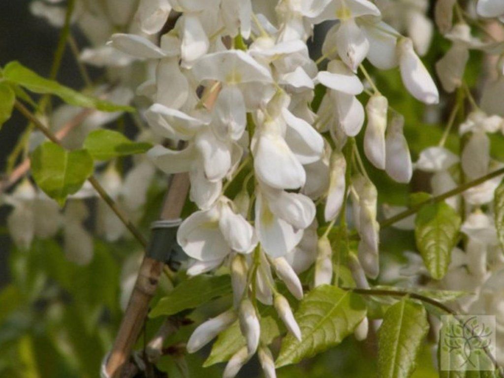Glyzinie chinesische 'Texas White' - eine weißblühende Sorte der chinesischen Art aus Zentralchina, wo die ursprüngliche Taxon hellen Waldrändern und buschigen Säumen bewächst. Sie wächst als laubabwerfende Kletterpflanze, wickelt sich linksherum und bildet mit dem Alter ein festes, allmählich kräftiger werdendes Holz. Unter den Bedingungen der Tschechischen Republik erreicht sie normalerweise eine Höhe von etwa 6–10 m und eine Breite von 3–6 m, je nach Standort und Wuchsform. Die Blätter sind unpaarig gefiedert mit 9–13 Fiederblättchen, beim Austrieb zart bronzefarben, in der Saison tiefgrün und im Herbst gelb. Sie blüht früh, normalerweise im April bis Mai, oft noch vor dem Laubaustrieb. Sie trägt dichte, hängende Trauben von etwa 20–30 cm Länge mit schmetterlingsförmigen Blüten, die fast gleichzeitig aufblühen und zusammenhängende weiße Girlanden bilden. Bienen und Hummeln werden von den Blüten angezogen, und in warmen Sommern kann es zu einer schwächeren Sommerblüte kommen. Nach der Blüte bilden sich schmale, samtig behaarte Hülsen, die oft bis in den Winter hinein erhalten bleiben. Alle Teile sind giftig, am giftigsten sind die Samen. In Kompositionen kommt sie auf Pergolen, Bögen und stabilen Wänden zur Geltung und kann bei sorgfältiger Führung auch Stammformen mit schirmartiger Krone bilden.