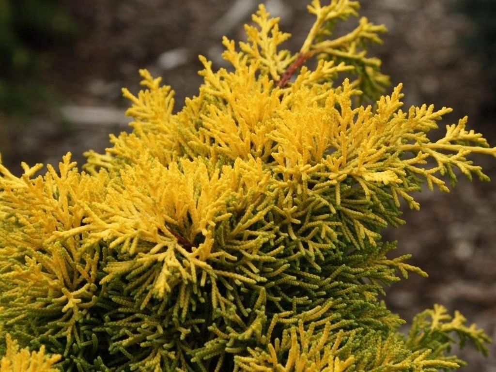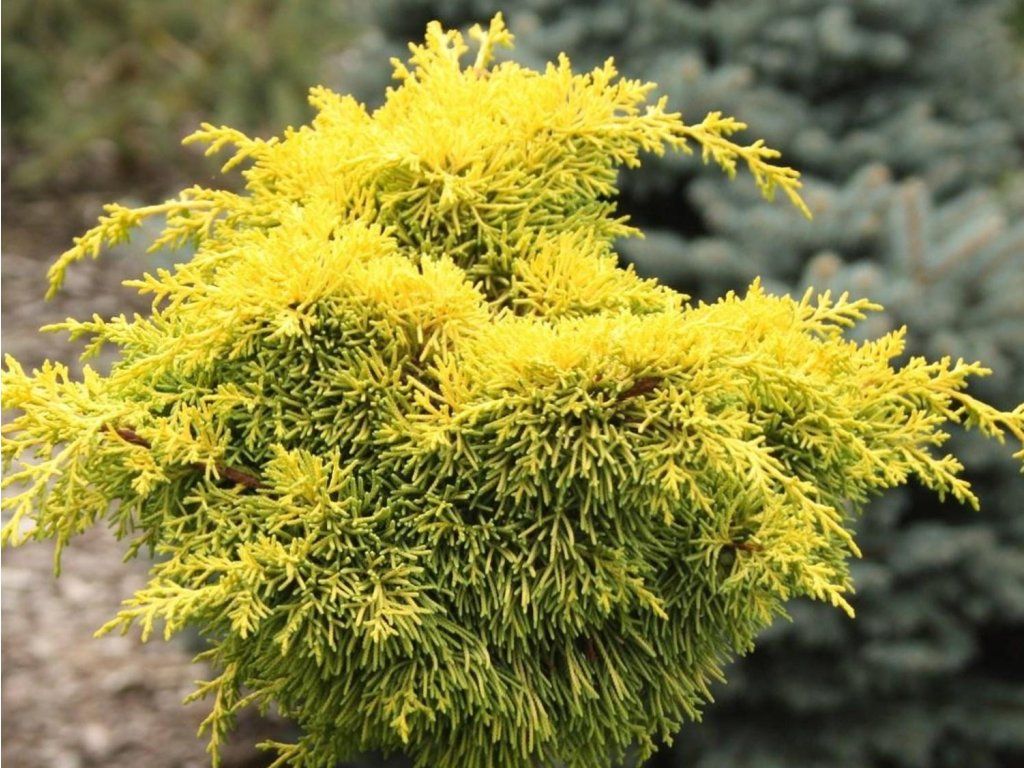 Chinesischer Wacholder 'Plumosa Aureovariegata' - ein Nadelgehölz von geringem Wuchs, das im Erwachsenenalter eine Höhe von etwa 1-2 m und eine Breite von 1,5-2,5 m erreicht. Das Wachstum ist sehr langsam. Dieser Wacholder hat sogenannte schuppenförmige Nadeln, sie sind flach, kleiner und an den Zweigen anliegend. Sie sind dunkelgrün gefärbt, einige Nadelspitzen haben eine gelb-bunte Färbung, die manchmal auch an den Zweigen auftreten kann. Mit näher rückendem Herbst kann sich die gelbe Färbung in bronzene Farbtöne ändern. Ein idealer Nadelbaum für Steingärten.