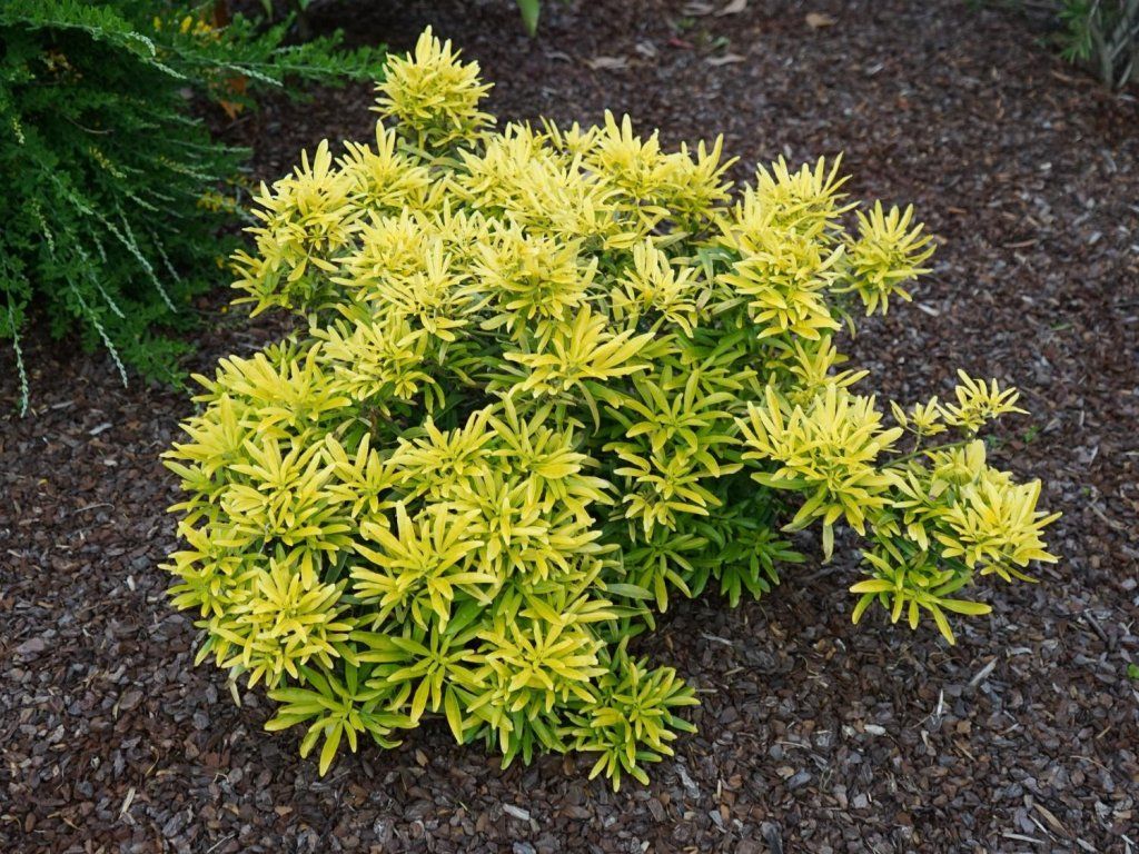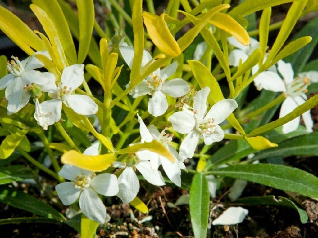 Choisie 'Aztec Gold' - kleiner, immergrüner Strauch, der bis zu 1,2 m hoch wird. Der Habitus ist abgerundet, sehr dicht. Die Blätter sind schmal, lanzettlich, haben eine grüne Farbe, neue Triebe sind goldgelb. Sie sind stark aromatisch. Die sternförmigen Blüten sind fünfteilig und reinweiß. Sie blühen von April bis Juni. Wir kultivieren die Pflanze als Kübelpflanze oder mit starkem Winterschutz.