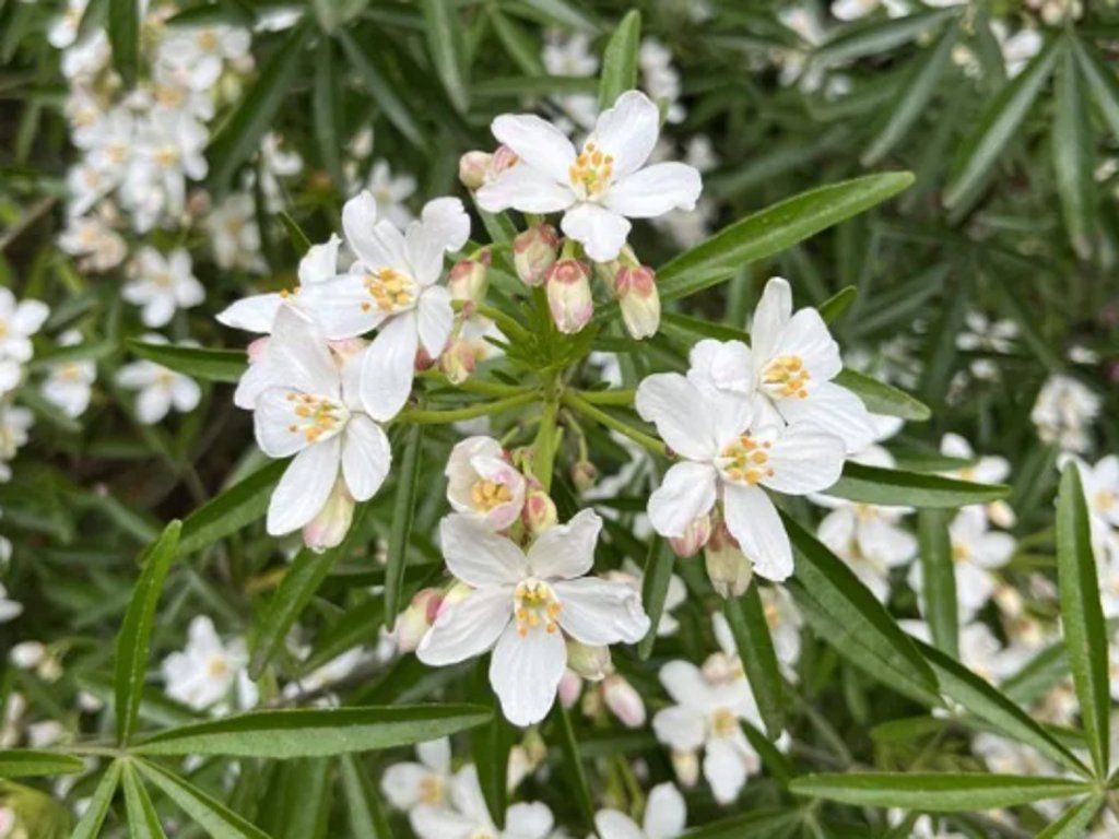 Choisya/Mexikanische Orangenblume 'Aztec Pearl' - ein immergrüner Strauch aus der Familie der Rautengewächse, der in England als Kreuzung zwischen Choisya ternata und Choisya arizonica gezüchtet wurde. Züchter ist Peter Moore und die Sorte wurde 1989 von den Hillier-Baumschulen eingeführt. Im Garten erfreut sie sich großer Beliebtheit wegen der feinen Blatttextur und des Duftes, der an Orangenblüten erinnert, sowie wegen der Auszeichnung RHS Award of Garden Merit. Der Habitus ist locker kugelförmig bis leicht ausgebreitet, im Erwachsenenalter normalerweise 1,5–2,5 m hoch und ähnlich breit, mit dichter Verzweigung von der Basis an. Die Blätter bestehen aus 3–5 schmalen Blättchen, sind glänzend, tiefgrün und beim Zerreiben aromatisch. Im April und Mai erscheinen Blütenknospen-Rispen mit einem rosafarbenen Hauch, aus denen sich weiße, sternförmige Blüten mit einem Durchmesser von etwa 2,5–3 cm und ausgeprägten gelben Staubgefäßen öffnen. Oft folgt eine schwächere, aber sehr angenehme Herbstblüte im September. Blüte und Blatt duften, und die Pflanze ist bienenfreundlich, daher eignet sie sich für Nutz- und Ziergärten, für Terrassen und für Kübel, wo der Duft beim Vorbeigehen zur Geltung kommt. Wie andere Rautengewächse enthält sie aromatische Stoffe und kann beim Verzehr leicht giftig sein. In der Komposition harmoniert sie gut mit Lavendel, Santolina, Salbei und feinen Gräsern, die den mediterranen Charakter des Strauches unterstreichen.