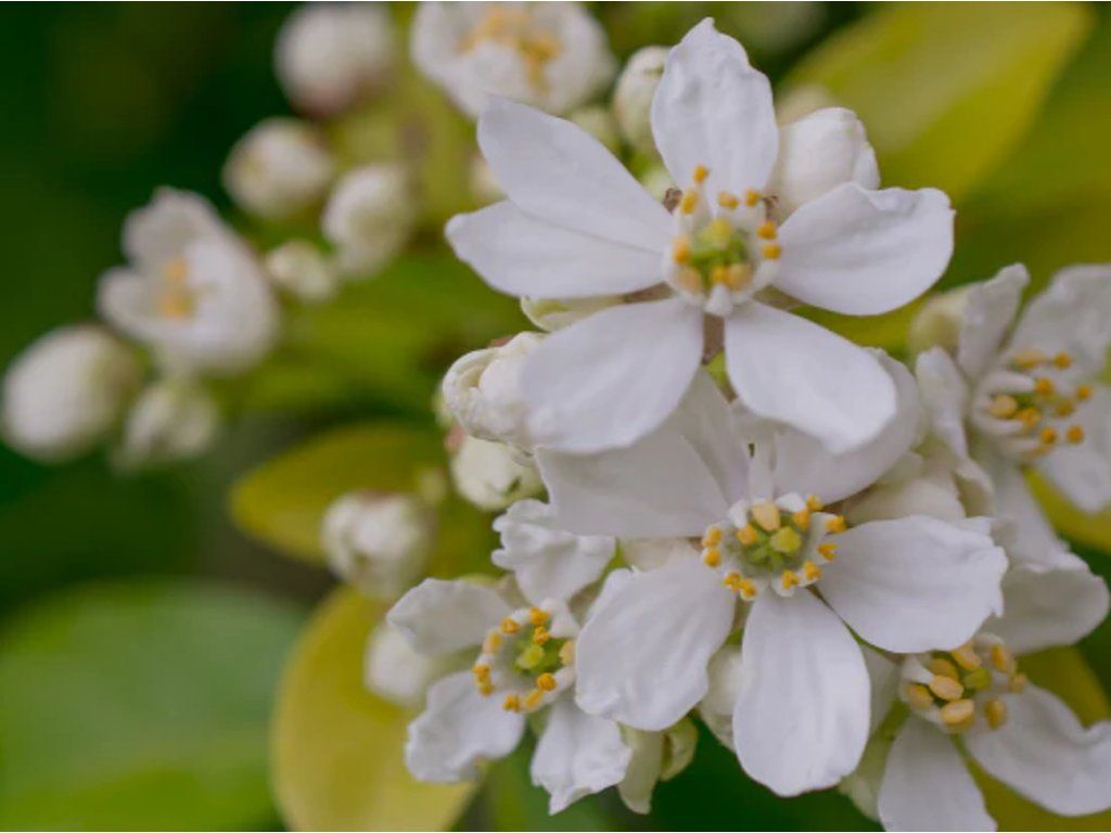Choisya/Mexikanische Orangenblume 'Tiny Dancer' - eine moderne Sorte der Mexikanischen Orangenblume, einer botanischen Art, die aus den Bergregionen Mexikos stammt, wo sie in lichten Wäldern und an deren Rändern auf durchlässigen Böden wächst. Die Sorte 'Tiny Dancer' wurde in Europa gezüchtet, um ein sehr kompaktes Wachstum und eine feinere Blattstruktur zu erzielen, die für heutige kleinere Gärten und die Kübelpflanzung geeignet ist. Der Strauch erreicht eine Höhe von ca. 0,6-0,8 m und eine Breite von 0,6-0,8 m, wächst langsam und bildet von Natur aus eine dichte, kugelförmige Wuchsform. Seine Blätter sind dreizählig gefiedert aus schmalen, schlanken Blättchen, dunkelgrün, glänzend und bei Berührung deutlich aromatisch mit einem Hauch von Zitrone. Die Blüte erfolgt von April bis Mai, wenn sich an den Triebspitzen kleinere Büschel weißer Blüten mit einem Durchmesser von etwa 3 cm bilden. Die Blüten sind zart duftend und bienenfreundlich. Dank seines immergrünen Laubes bleibt der Strauch auch im Winter ein markantes Element im Garten. In Kompositionen wird er als Solitär, in niedrigen Strauchgruppen, in Kombination mit Stauden und Ziergräsern oder als strukturelles Element in Kübeln auf Terrassen und Balkonen eingesetzt.