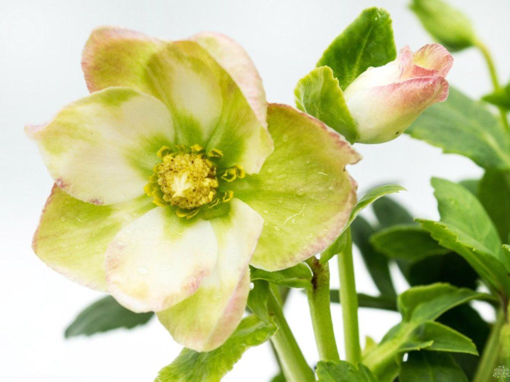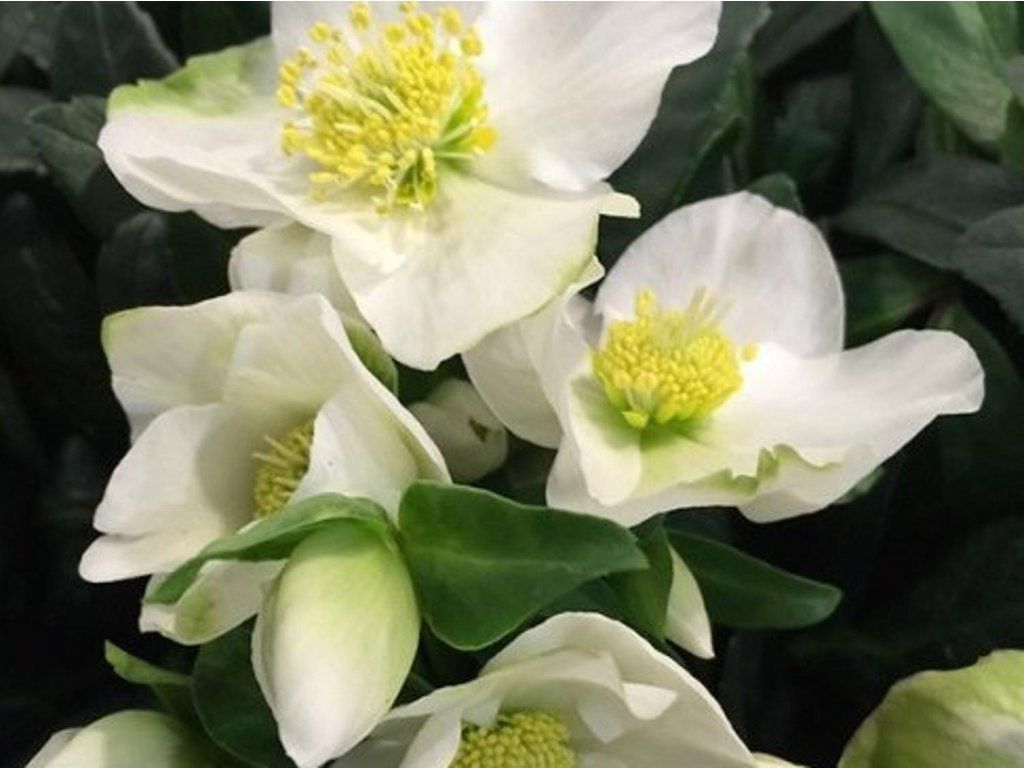 Schwarze Nieswurz 'Christmas Carol White' - eine wunderschöne horstbildende Staude, die bis zu 10 - 20 cm hoch wird. Wie der Name schon sagt, handelt es sich um eine früh blühende Sorte. Die Blüten erscheinen bereits vor Weihnachten und halten je nach Wetter bis ins zeitige Frühjahr an. Sie blüht sehr reichlich und die Blüten sind klassisch schalenförmig mit ausgeprägten gelben Staubgefäßen. Aus grün-rosa Knospen entfalten sich reinweiße Blüten, die einen schönen Kontrast zu den immergrünen, dunklen Blättern bilden. Eine ideale Pflanze für Staudenbeete und Kübel.