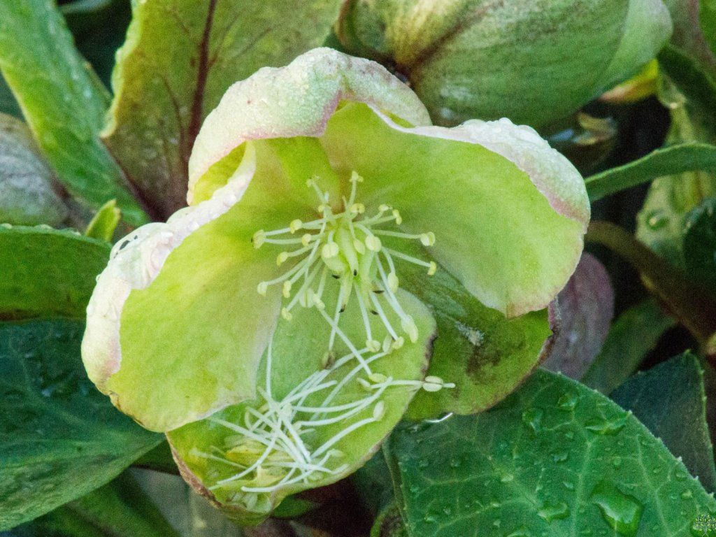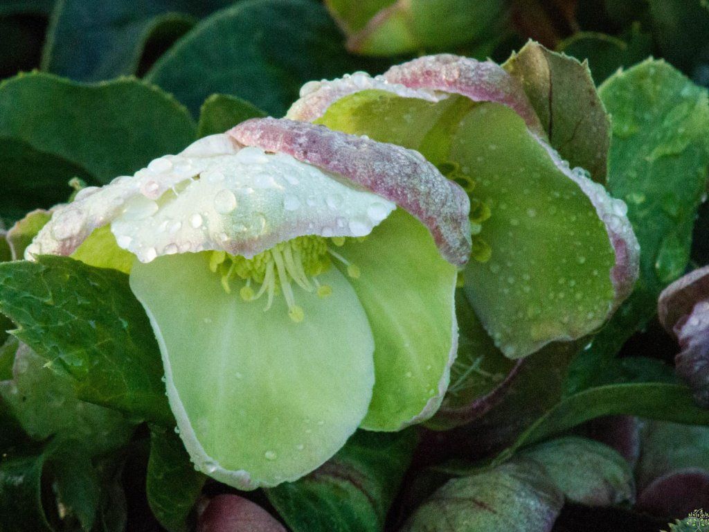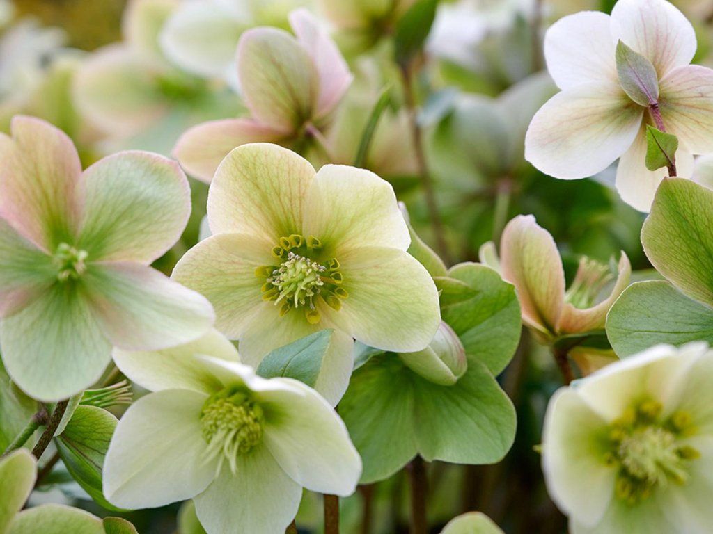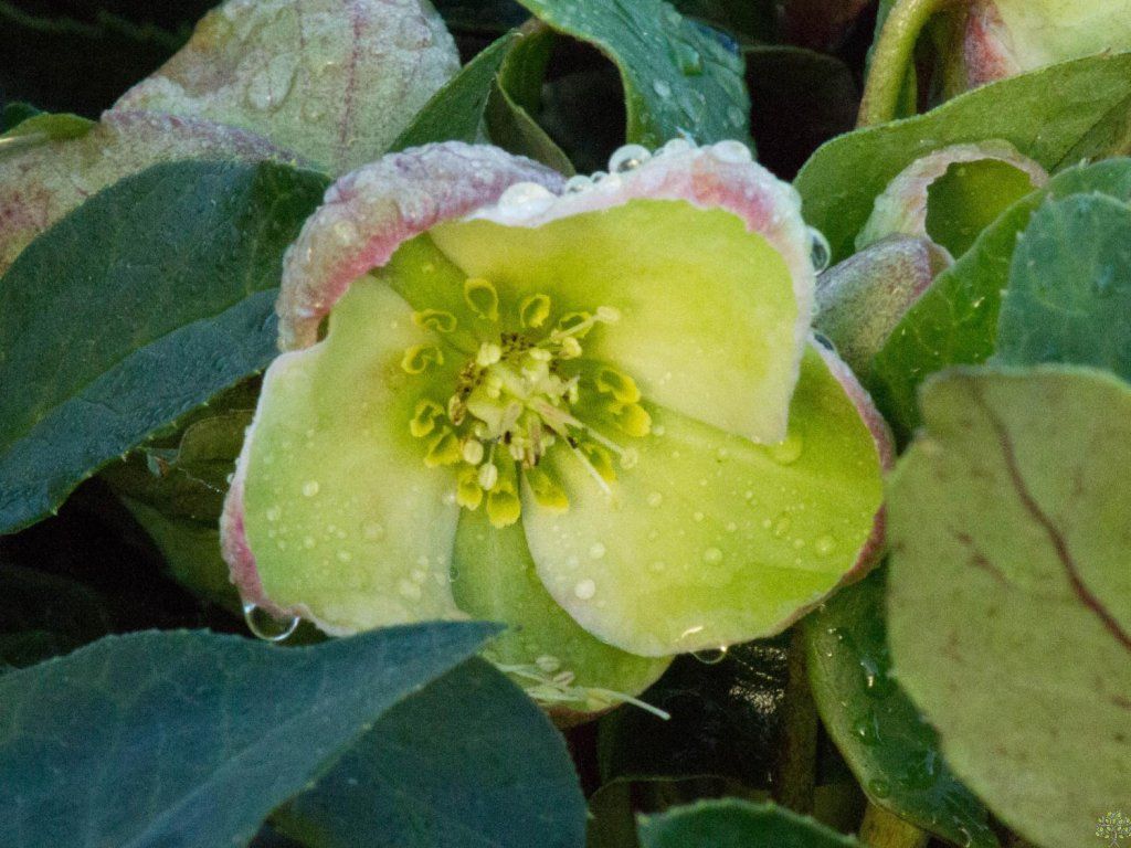 Christrose 'Diamonfire' - eine wunderschöne Christrose, die mit ihren Blütenständen besticht. Diese sind grünlich-weiß mit einem Hauch von Rosa und einem zarten Glanz, was ihr ein sehr feines Aussehen verleiht. Diese Staude blüht am Übergang vom Winter zum Frühling, was sie zu einer ausgezeichneten Wahl macht, um den Garten in einer Zeit zu beleben, in der es wenig andere blühende Pflanzen gibt. Die Blätter sind dunkelgrün, ledrig und bilden einen schönen Kontrast zu den dunklen Blüten. Wie andere Christrosen ist sie immergrün und gut frostbeständig. Sie eignet sich für moderne und klassische Gärten und kann ein schöner Solitär oder Teil von gemischten Beeten sein.