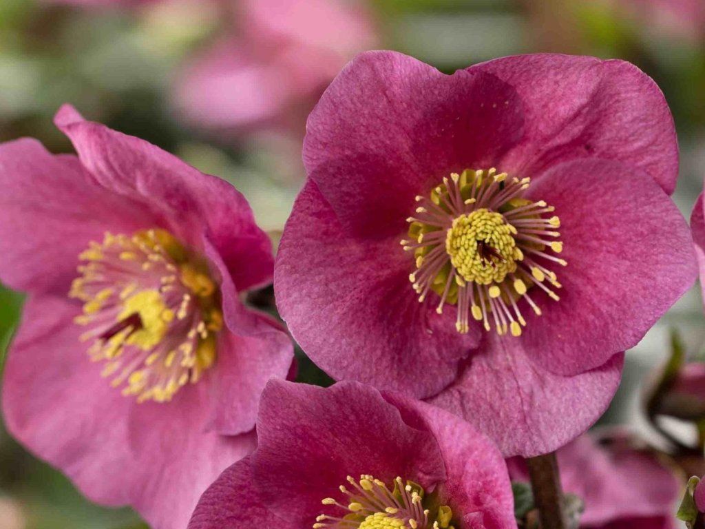 Christrose 'HGC Leona' - ein bezaubernder Christrosen-Kultivar, der eine Höhe von etwa 30-40 cm erreicht. Sie zeichnet sich durch große, tiefrosa Blüten aus. Auf den ersten Blick wirkt sie samtig. In der Mitte der Blütenblätter erheben sich beige gefärbte Staubgefäße. Die Blüten werden von kräftigen Stielen getragen, die aus üppigen Büscheln von ledrigen, immergrünen, handförmigen und dunkelgrünen Blättern wachsen. Wenn die Temperaturen im Winter günstig sind, können die ersten Blüten Sie bereits im Dezember überraschen und bis April halten.