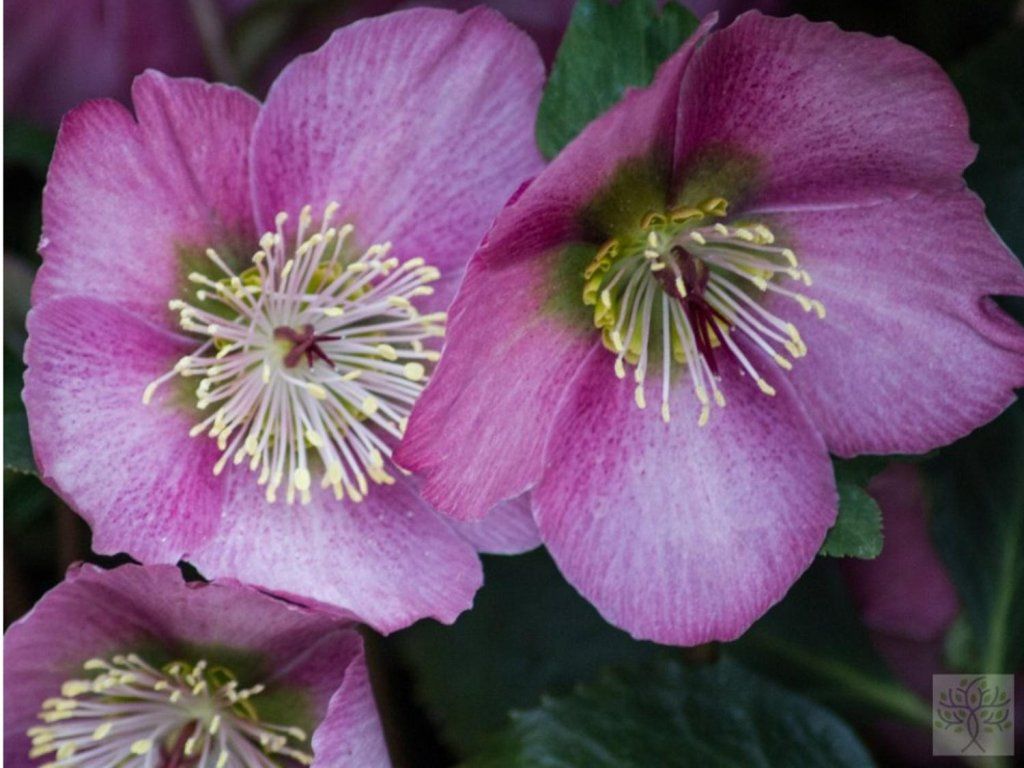 Lenzrose 'HGC® Madame Lemmonier' - eine fantastische Lenzrosensorte. Sie hat riesige Blüten, die im Durchschnitt bis zu 10 cm groß sind. Sie sind kräftig und sehr interessant gefärbt. Sie haben eine dunkel-pastellrosa Farbe. Den Blüten verleiht ein Büschel gelber Staubblätter mit einer dunklen Narbe in der Mitte Erhabenheit – die Blütenkrone. Sie erreicht eine Gesamthöhe von etwa 20–30 cm und eine Breite von ca. 40 cm. Sie blüht an kräftigen Stielen, bei milden Wintern bereits ab Dezember und blüht bis April. Die Blätter sind dunkelgrün, immergrün und ledrig.